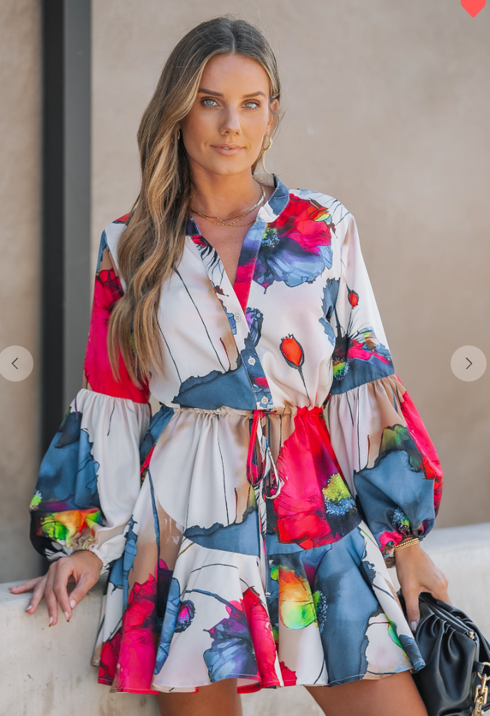 We love the flower paint billowy fit and flow skirt, split neckline,