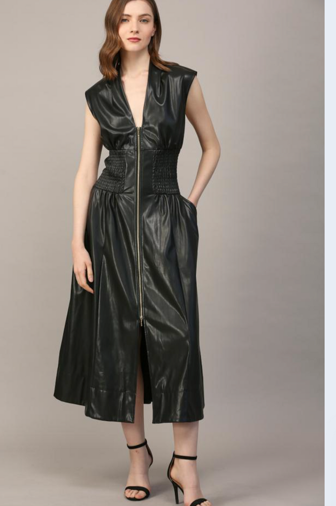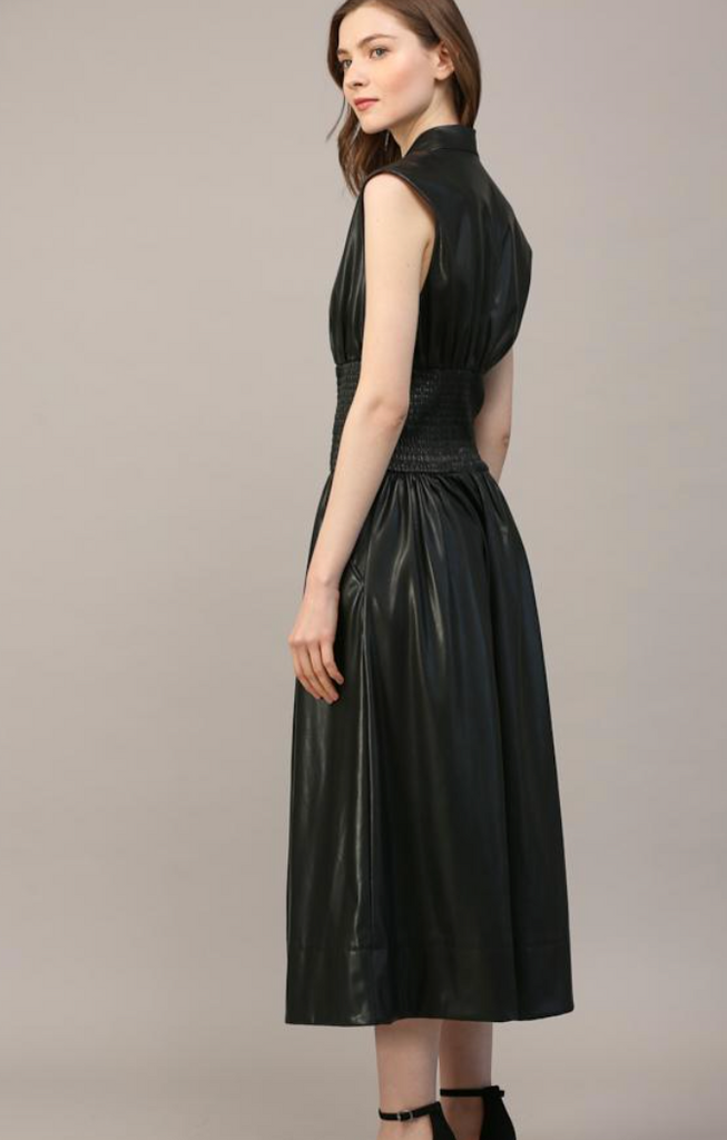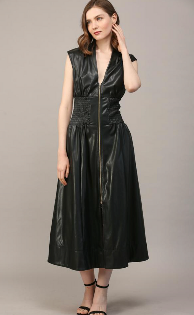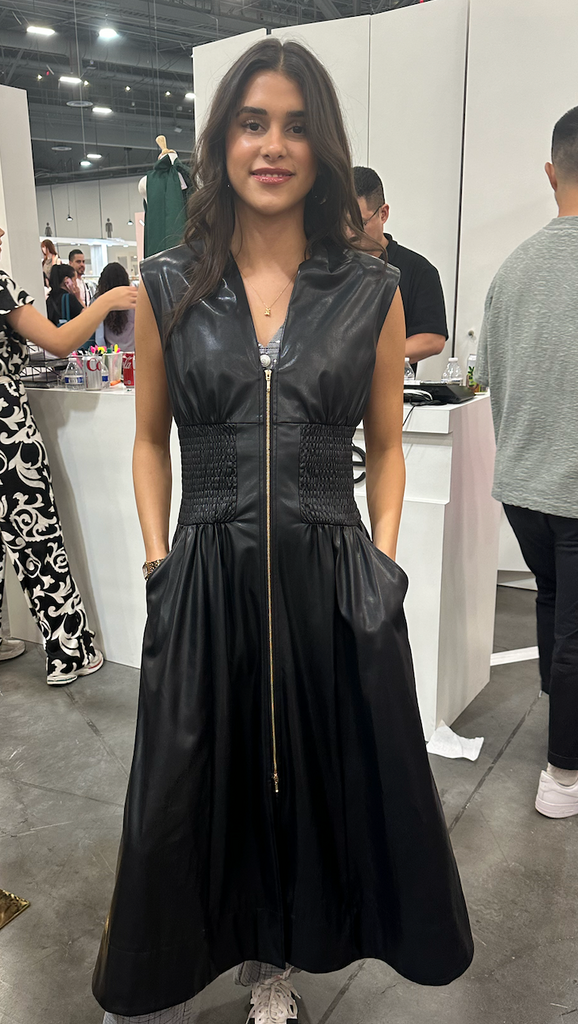 We saw this last week on our buying trip in VEGAS and we love the VEGAN leather zip front and smocked waist. Universally flattering and universally amazing! This Looks good on everyone and it is the prefect dress for now all they way through fall. Great Midi length and has pockets. Wear sleeveless or throw on a cute cardi