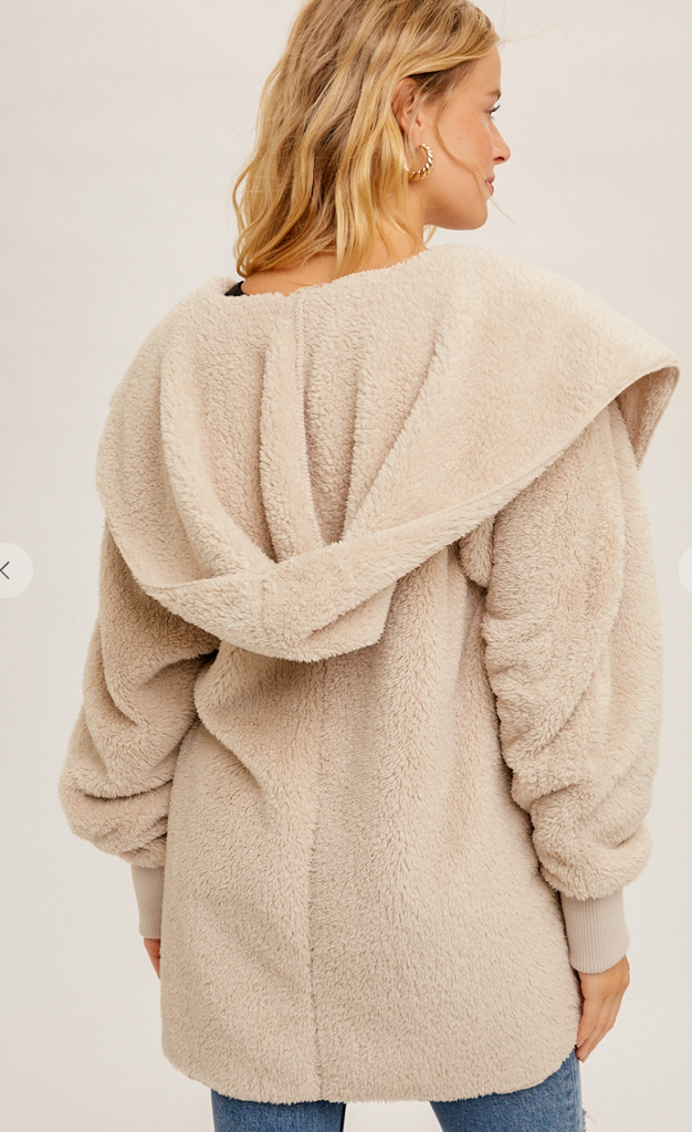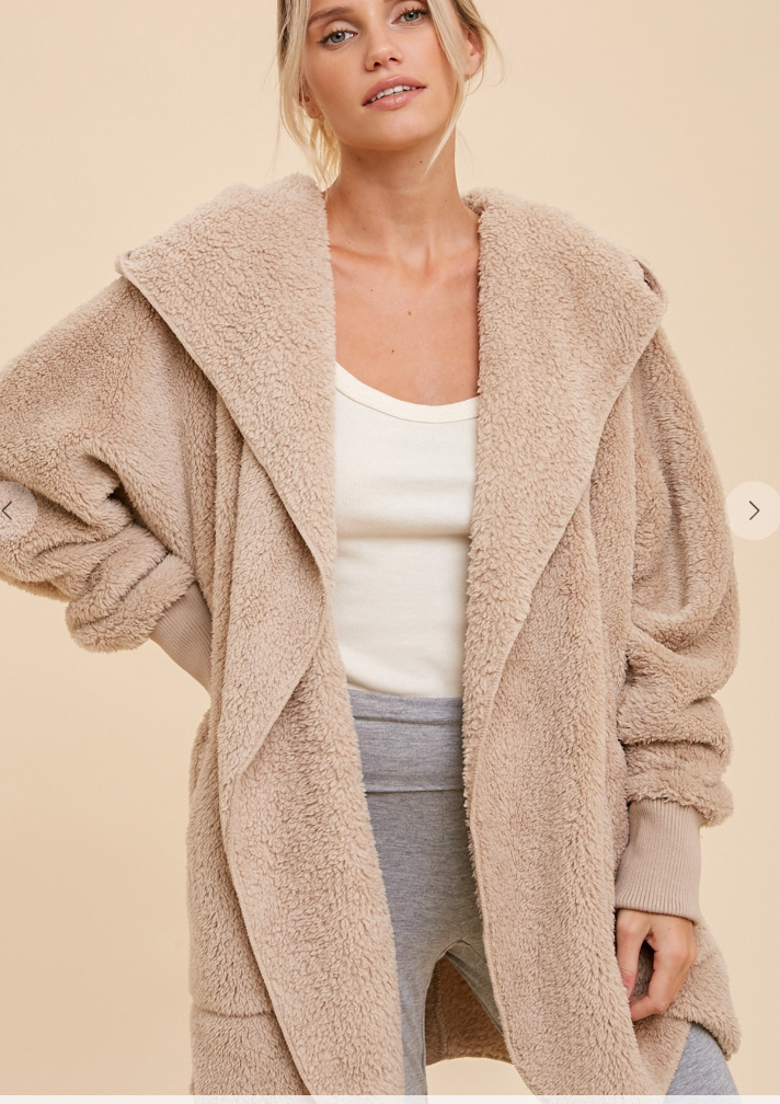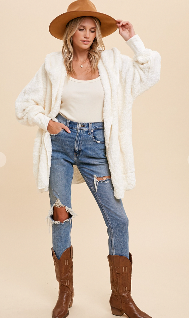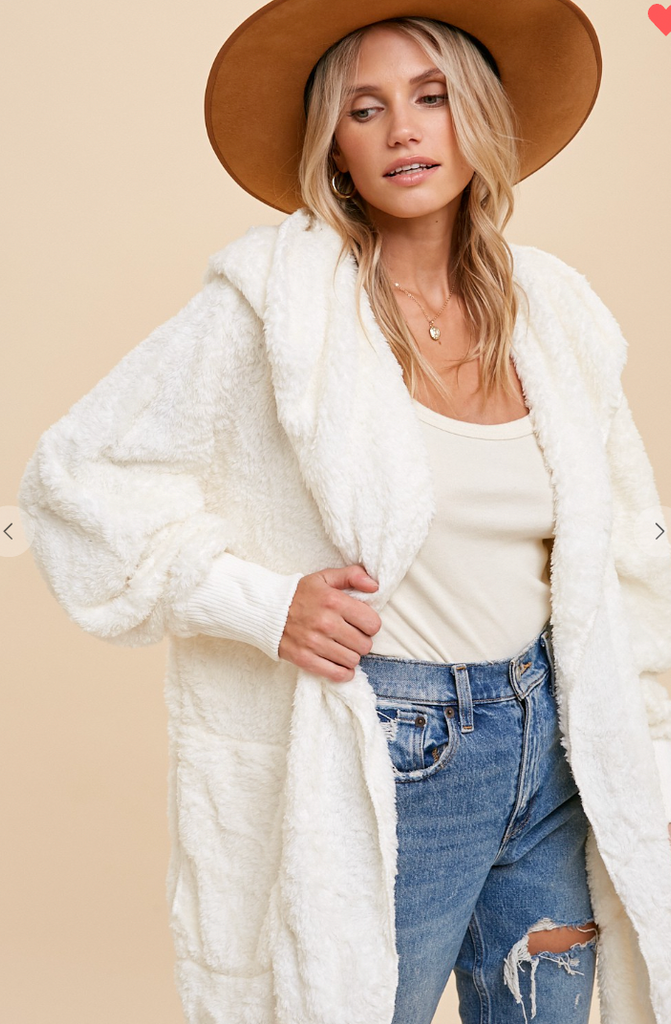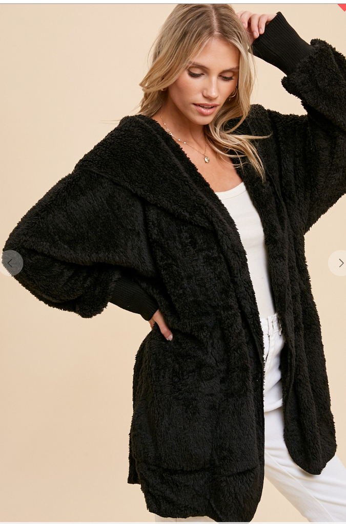 This Faux fur, plush hooded jacket with an open front and side pockets above hem also