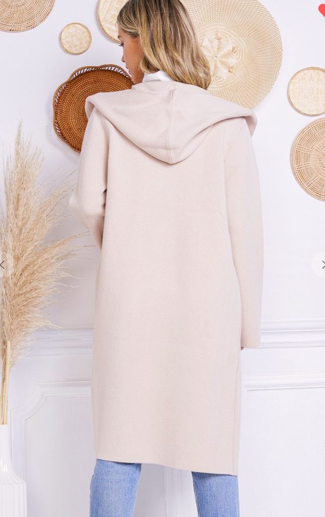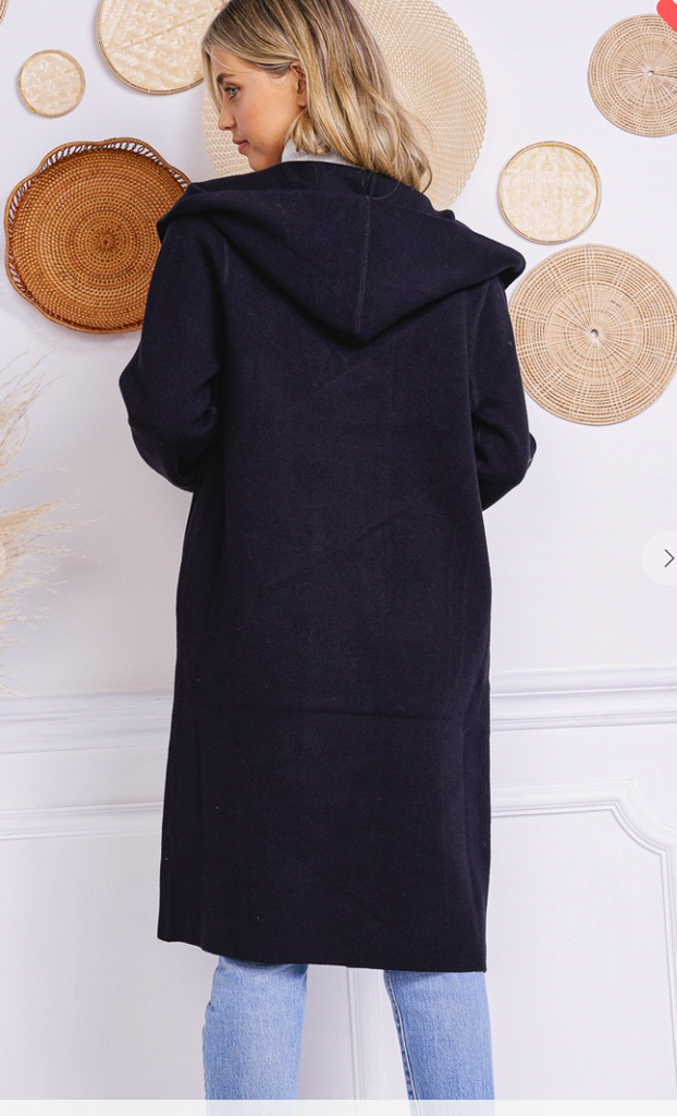 A Gorgeous Rayon/Nylon/Cashmere Blend, this coat is a Classic! The styling is on trend right now too. Side Pockets, Hood, and easy layering. Throw on with with yoga pants, to jeans and a sweater, to legging or a girls night out.