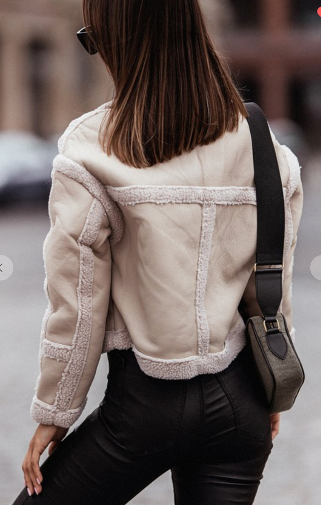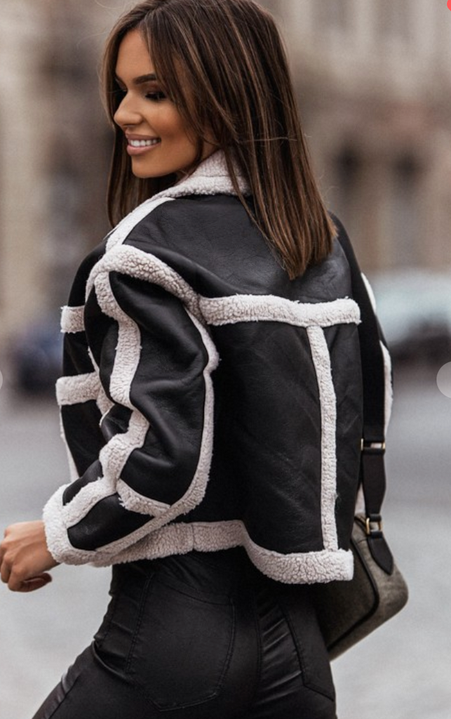 This new jacket is stunning. The combination of Vegan Leather and Sherpa is a showstopper! Love how this hits at the waist and looks so chic and classy!