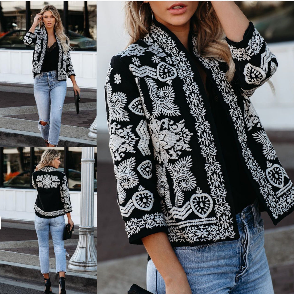 Our New Year makes a need a new fresh statement piece in our wardrobe! And this is just the one to make a bold and fab statement! It flaunts an embroidered floral motif in cream throughout a black cotton base. Constructed to fit true to size with long sleeves and an open front. A chic jacket to take your style from 0 to 100! Finished with full lining! Other boutiques are retailing at $128. Ship ours for only $89