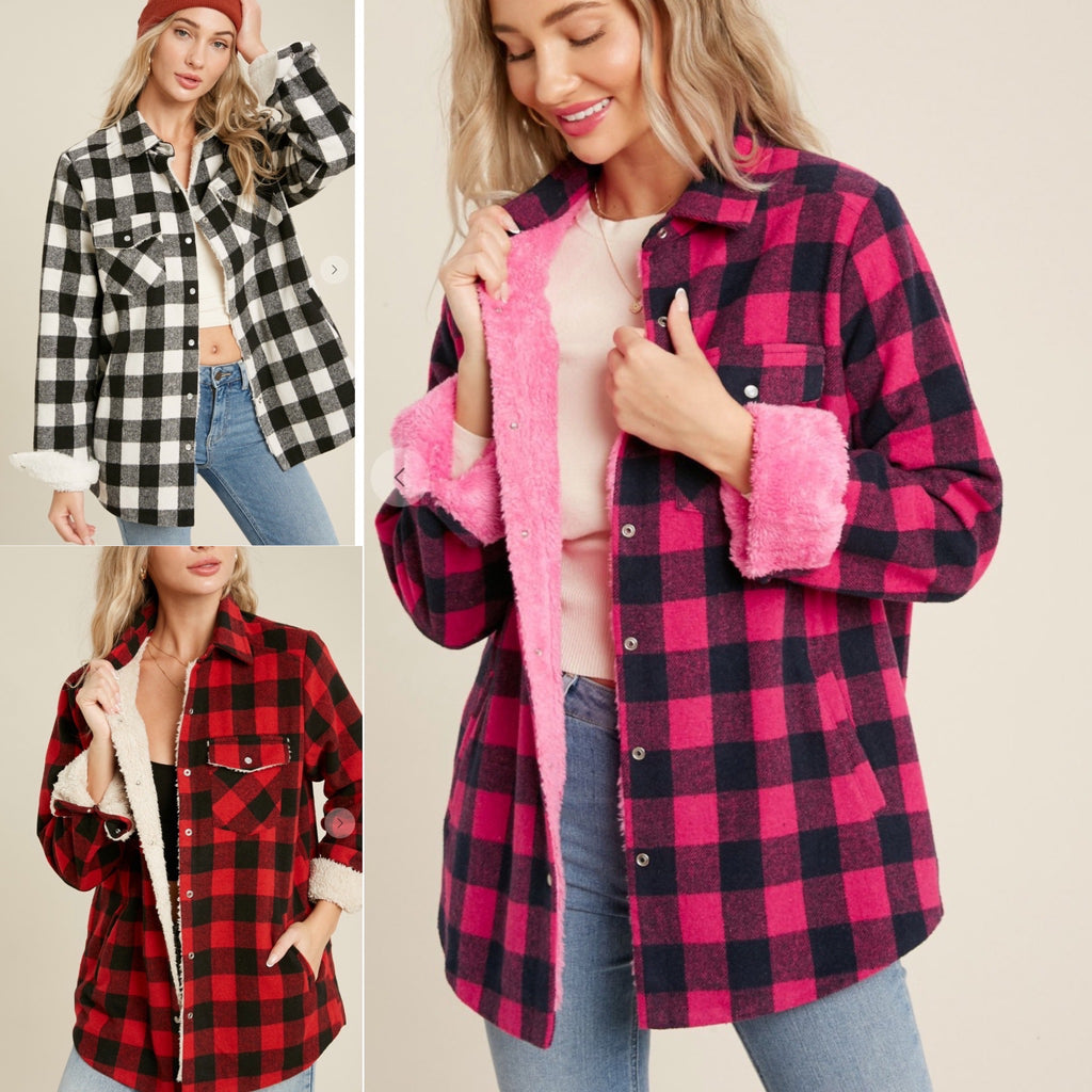 This Super Cute Buffalo Plaid Shirt/Jacket with Sherpa Lining will get you through the Holidays! Throw on for a run around town look, pack it for a lake or ranch weekend away, or just layer on for a cool morning carpool run.