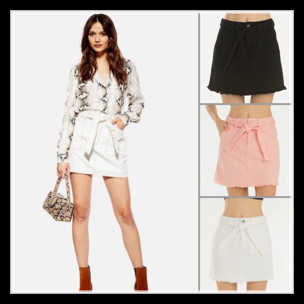 These skirts are so fun this season and such a great alternative to shorts when the weather is so hot! This one has a Self Belt, 2 Side Pockets and 2 Back Pockets and a Frayed Hem, Button and Zipper Closure!! Choose from White, Black or Pink Denim! 100% Cotton