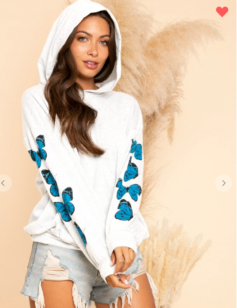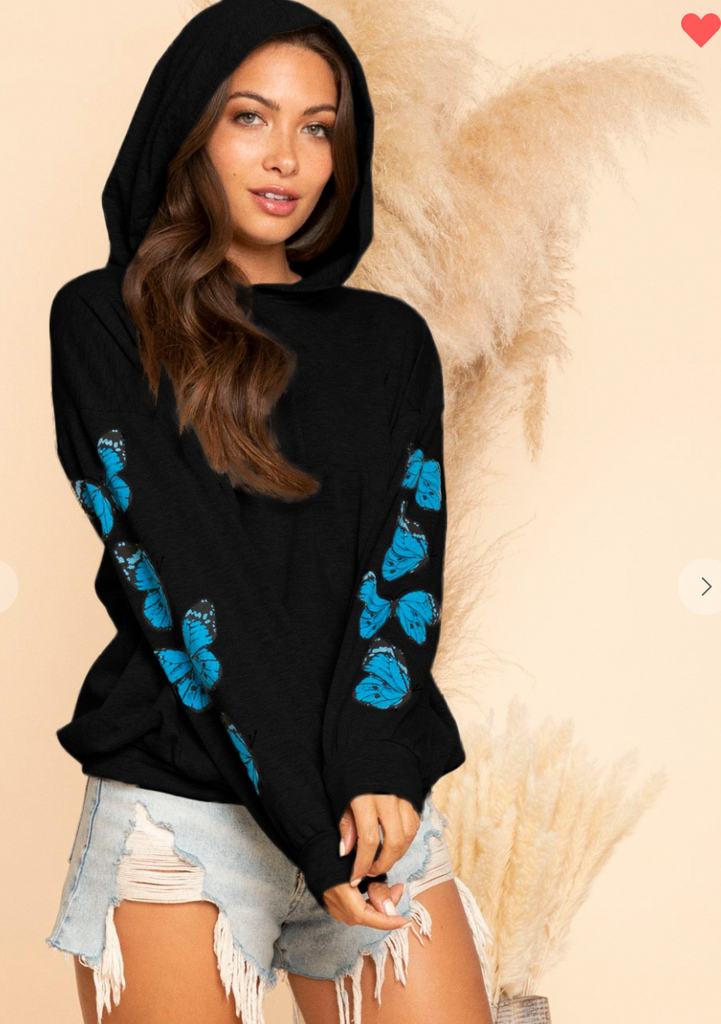 We are loving the look of this great soft hoodie! With the butterflies printed on each sleeve, and the soft french terry hoodie you can wear this all Winter long.