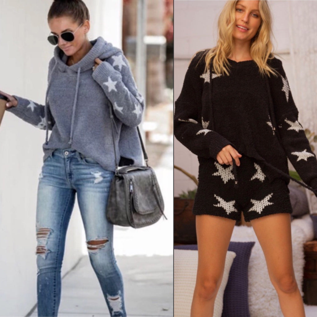 Our Ellison Star Light Hoodie needs no further introduction! This hoodie features white raw knit stars that detail the long sleeves. Style this soft and stretchy hoodie with denim and sneakers for a casual and leisure vibe!