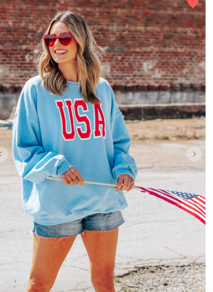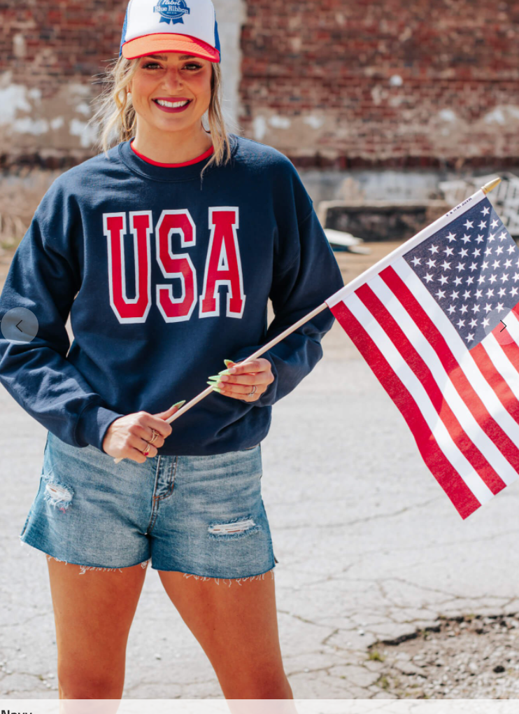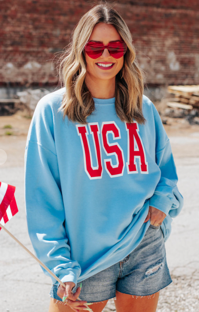 Let's throw it back with this retro USA Graphic tee and sweatshirt! The Varsity letters are