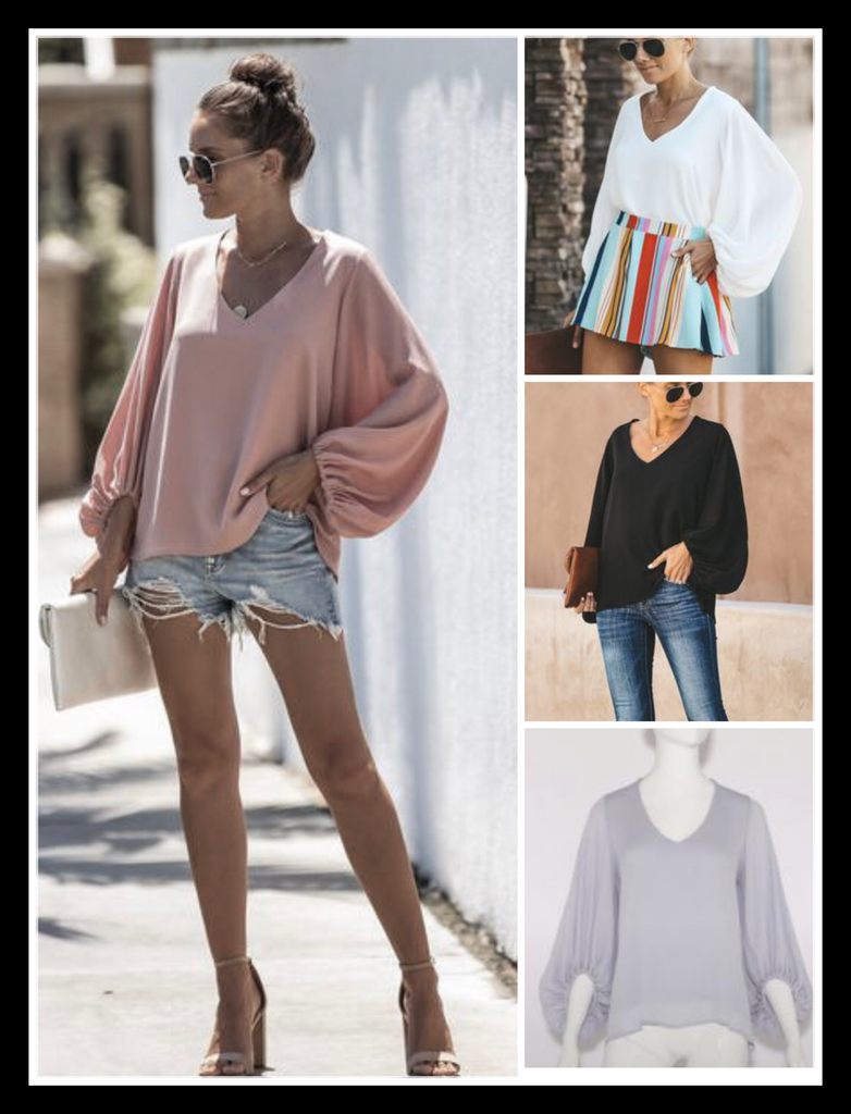 The balloon sleeve is the trend to try! We are stoked with the glamour and comfort a style like this gives. This Blouse is billowy, feminine, and chic! Rock this for work to weekend, dressing it up for a party with a statement earring or clutch and wearing it to the office with a skinny crop and a mule. The blousy fit, exaggerated sleeves, elastic wrist band and v-neckline make this top an easy go to for making a statement without even trying!
