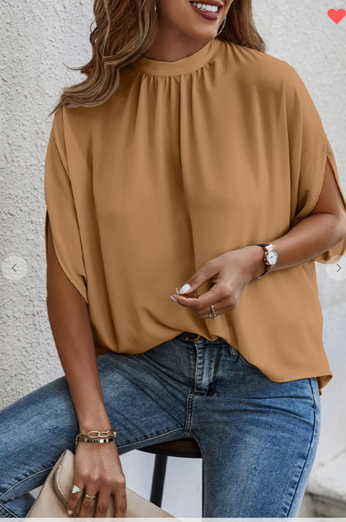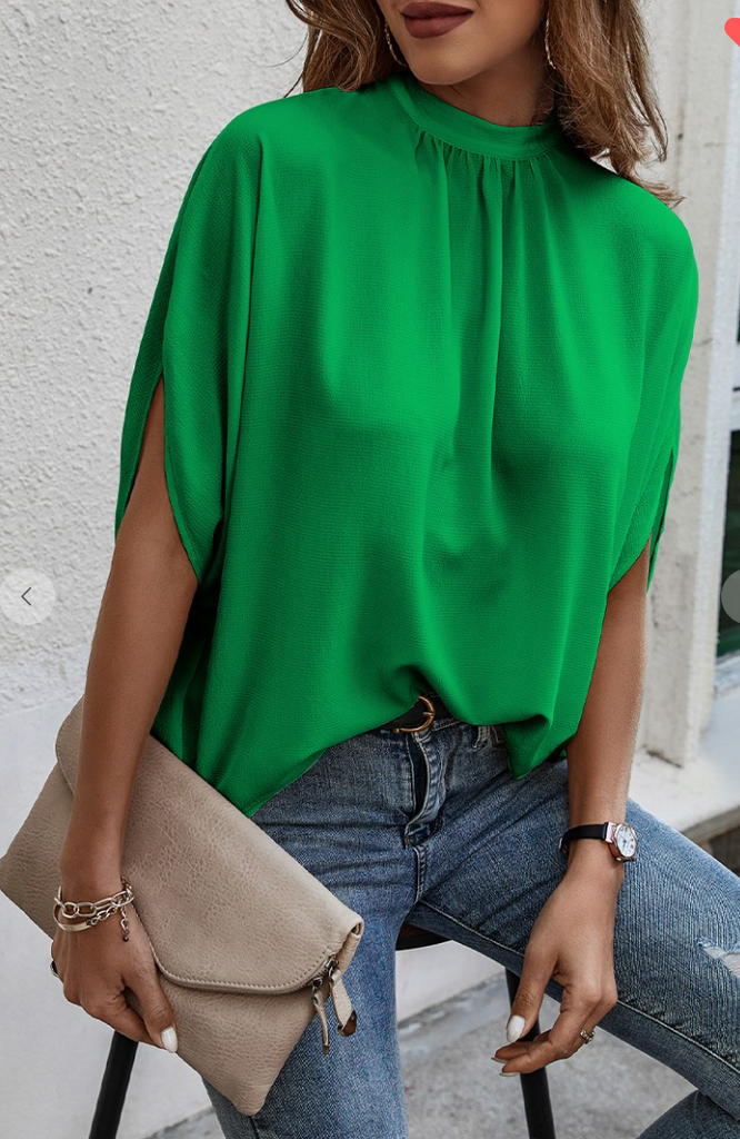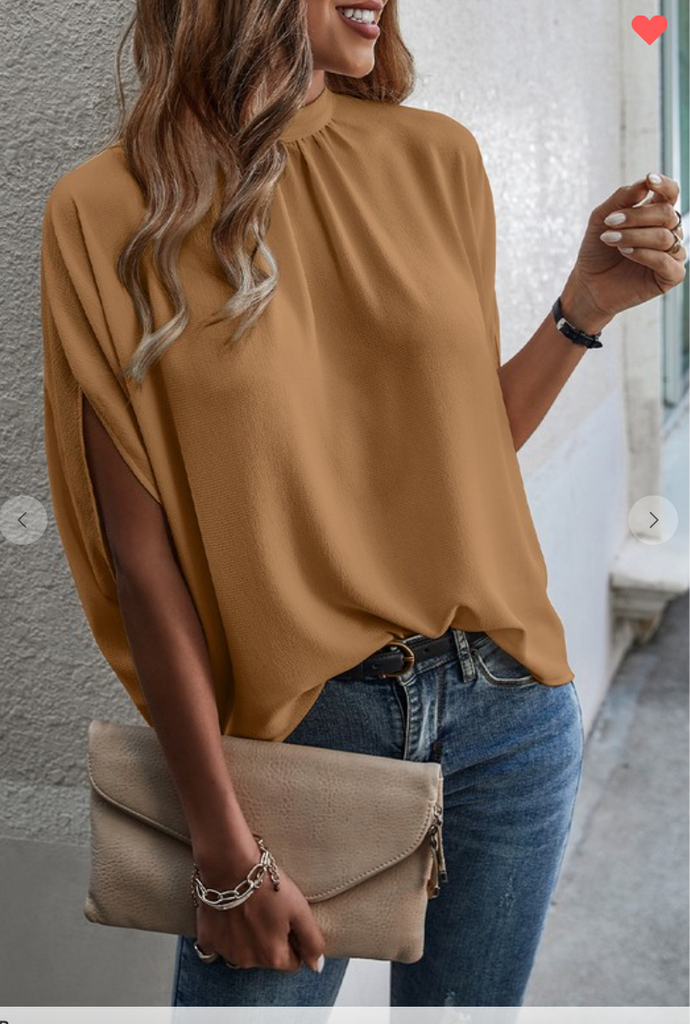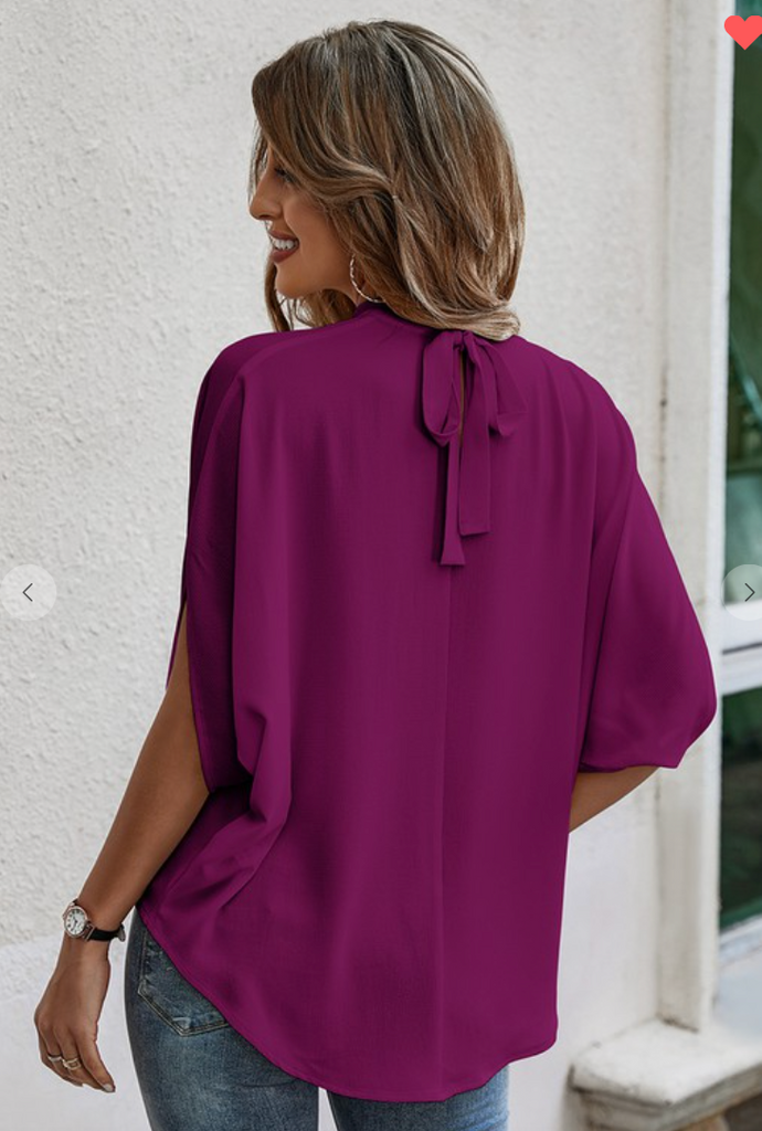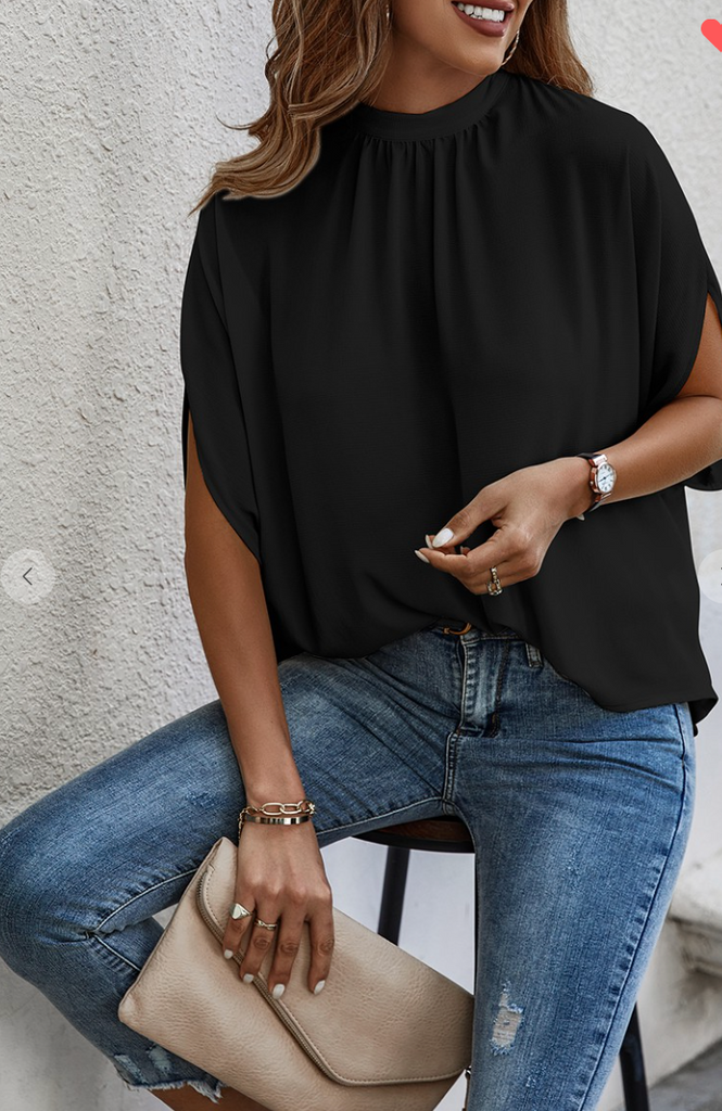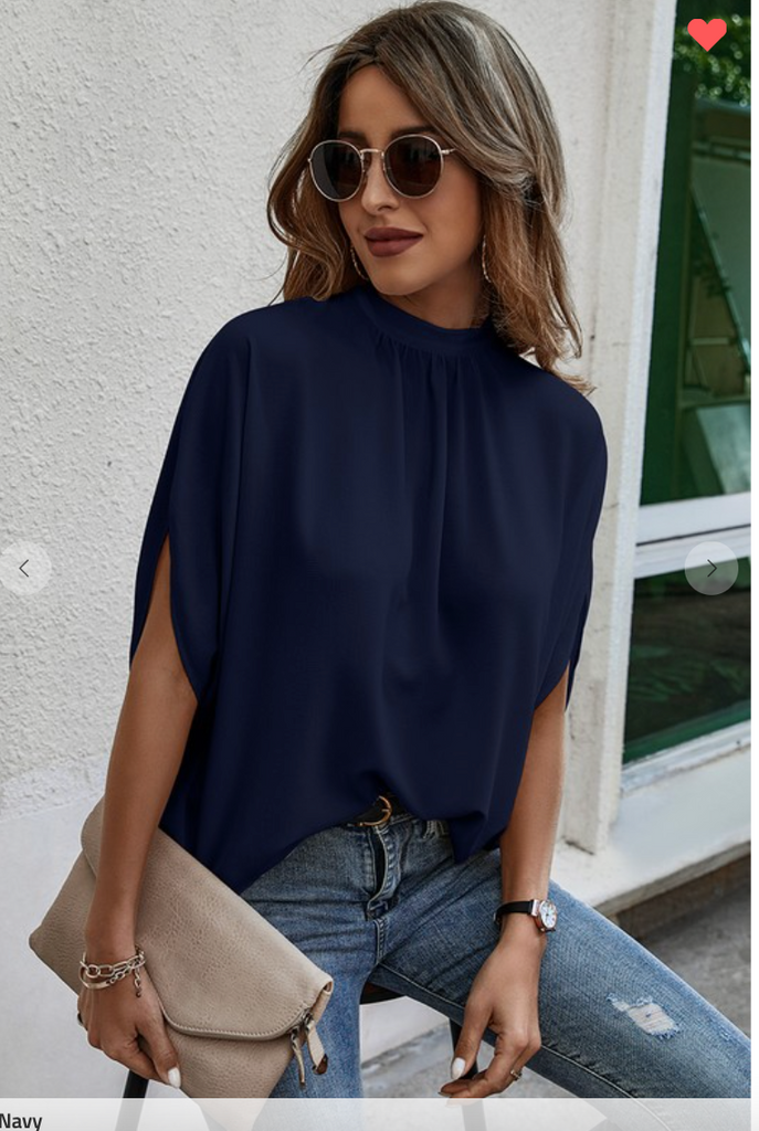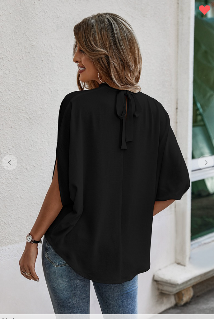 Our New Mock Neck, with cape half sleeve, loose fit and back tie will be just the thing you need! Wear now under a cardigan or jacket, and in the Spring pair with cute white jeans!