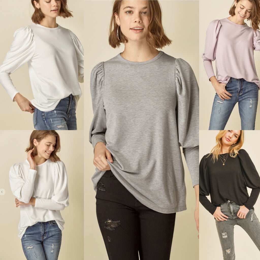 The puff sleeves at the top and cute more fitted sleeve make it sooo darling! Wear now and with jean shorts in the Spring!!