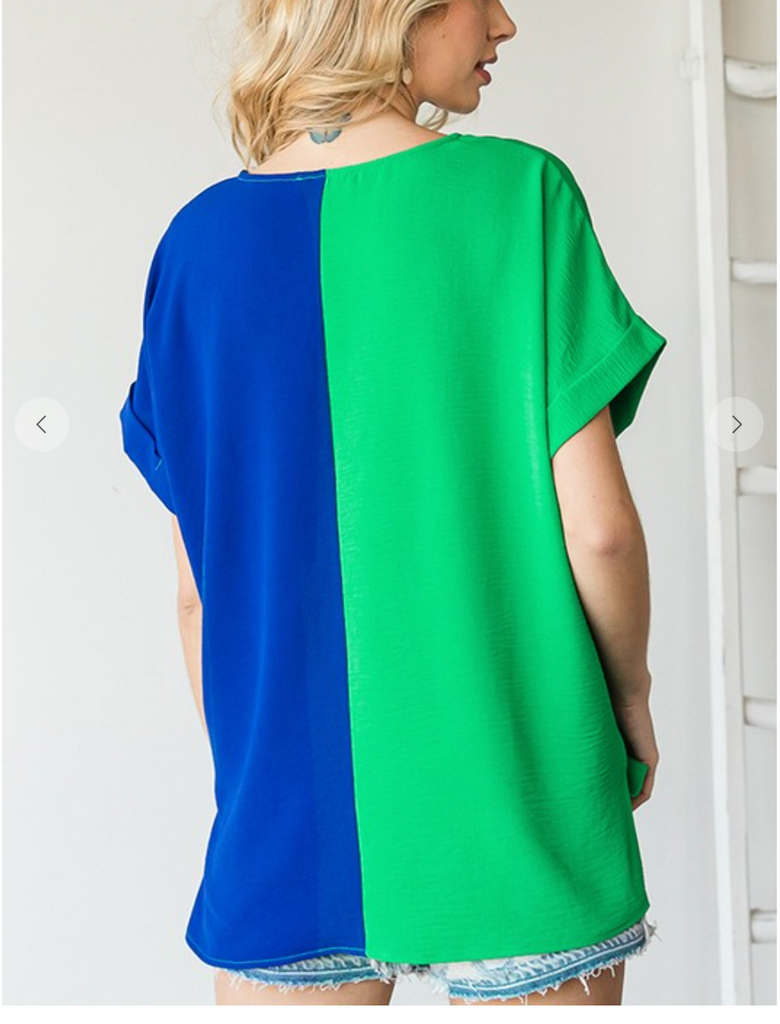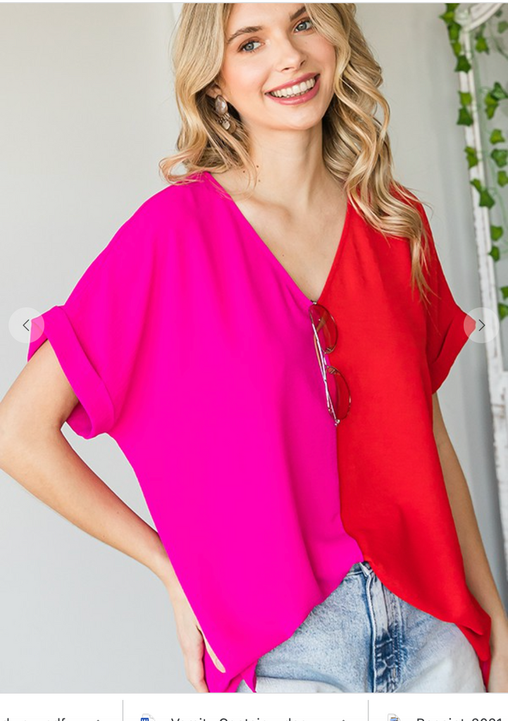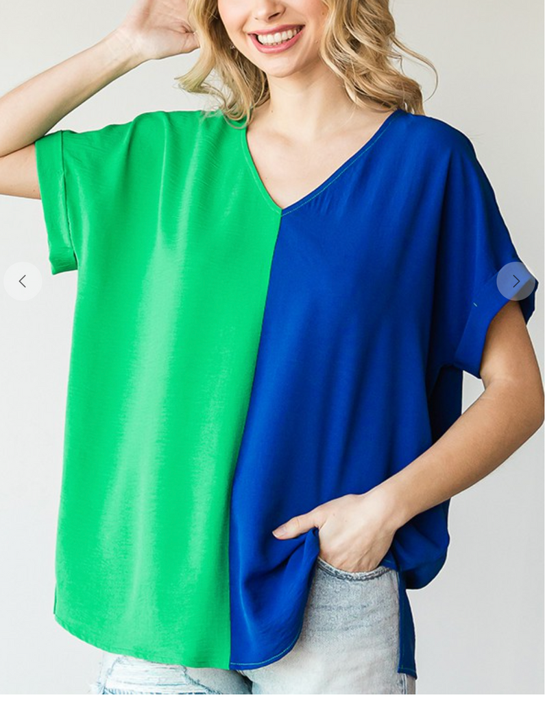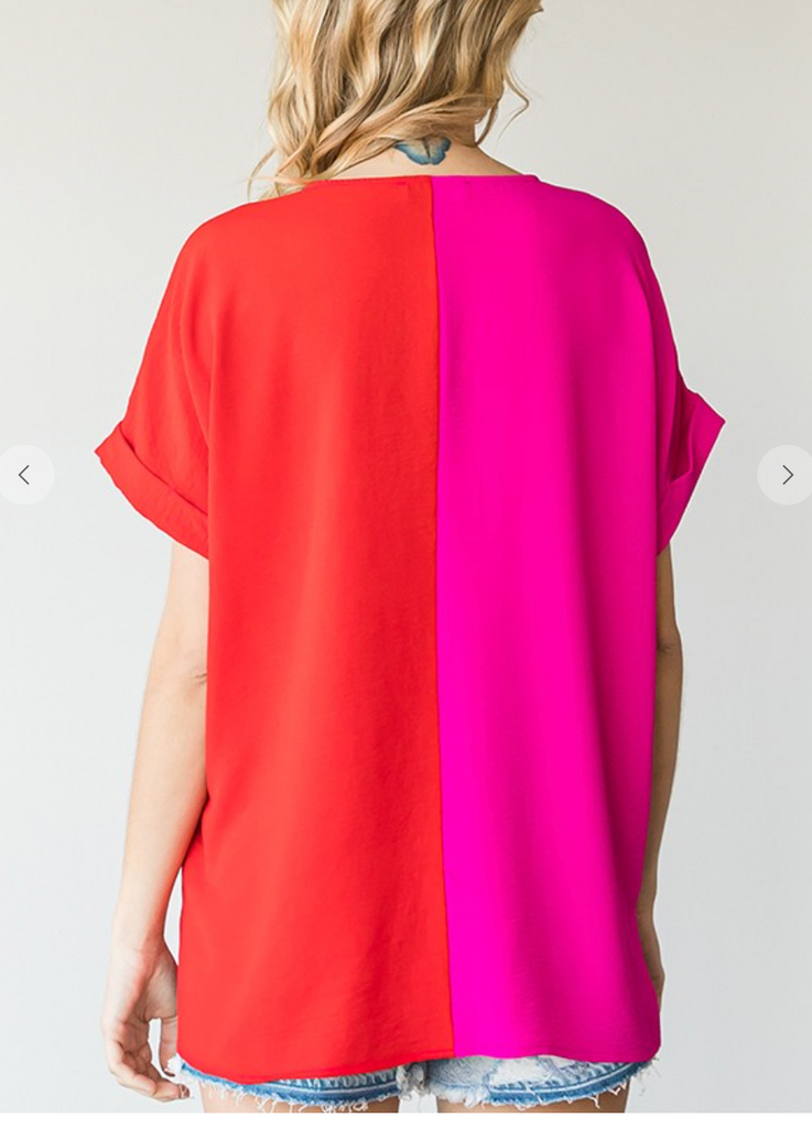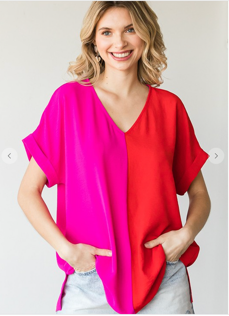 SA solid duo-tone colorblock boxy top with a V-neckline, side slicks and cuffed short sleeves.It is no sheer, lightweight, will travel well