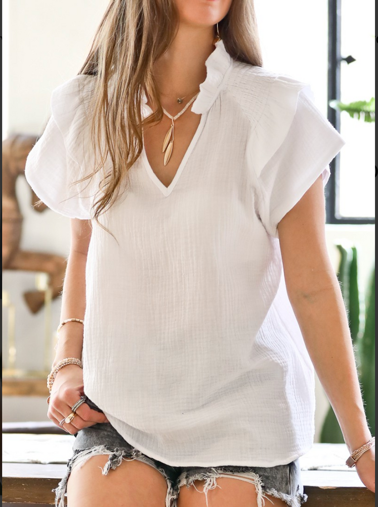 These are my favorite kind of tops! We Love the Sleeve and the V!! So many of you have asked for more V Necks and this one delivers! How cute for Summer! So lightweight. It would be so cute with all white, or any of your fun summer shorts or skirts!! LOVE.