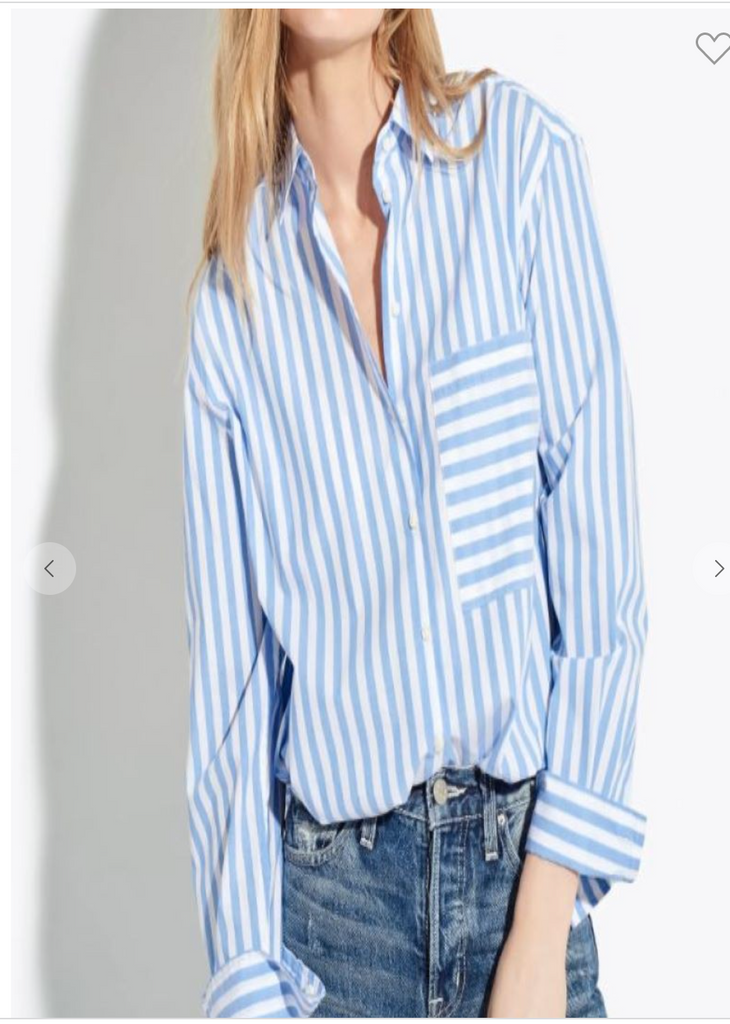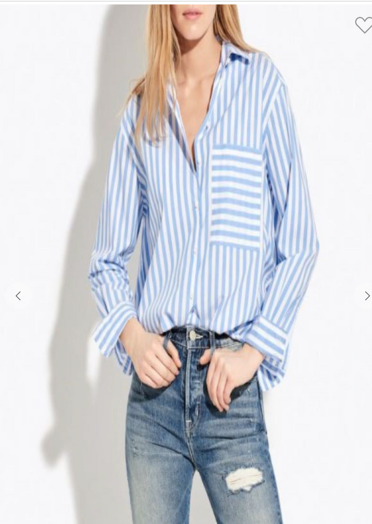 This style and stripe I saw in a High End Line in LA this weekend and  I knew we could find it! How cute with denim now and white denim or shorts in just a few weeks! Blue and white stripe is such a great classic look. It can really go with anything! Love the contrasting stripe pocket too!