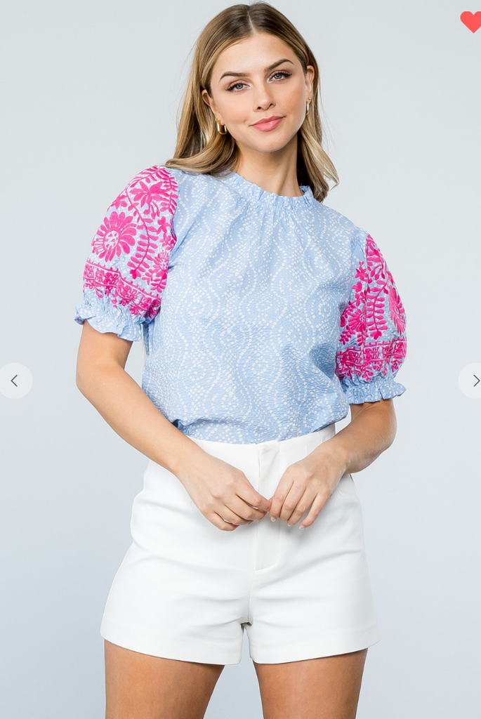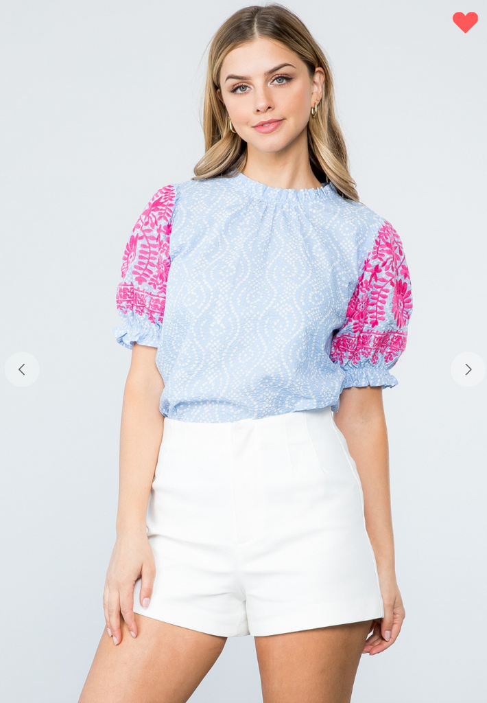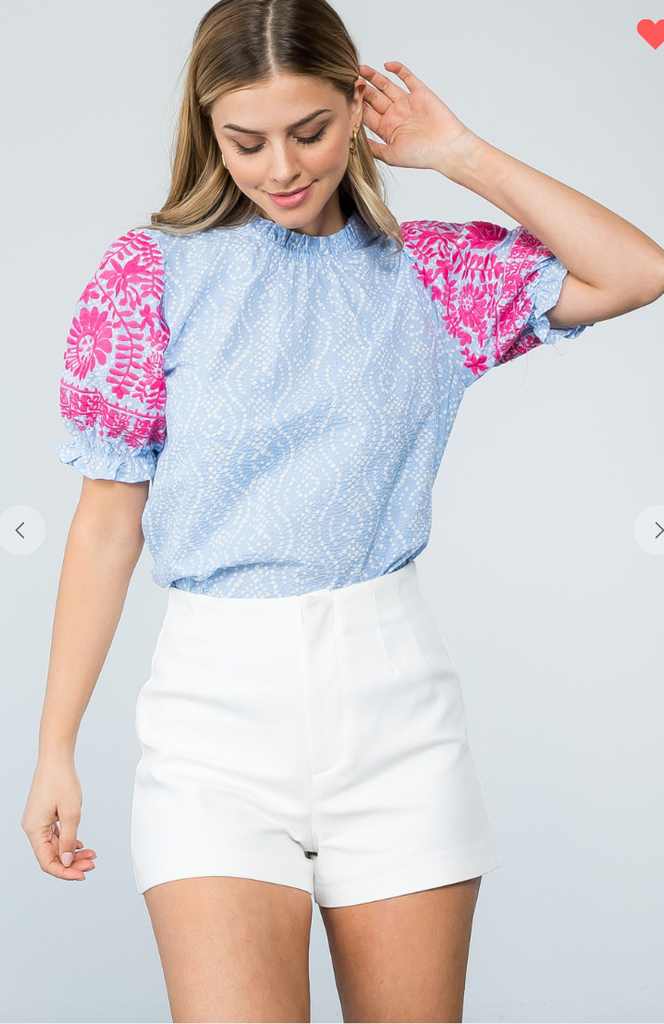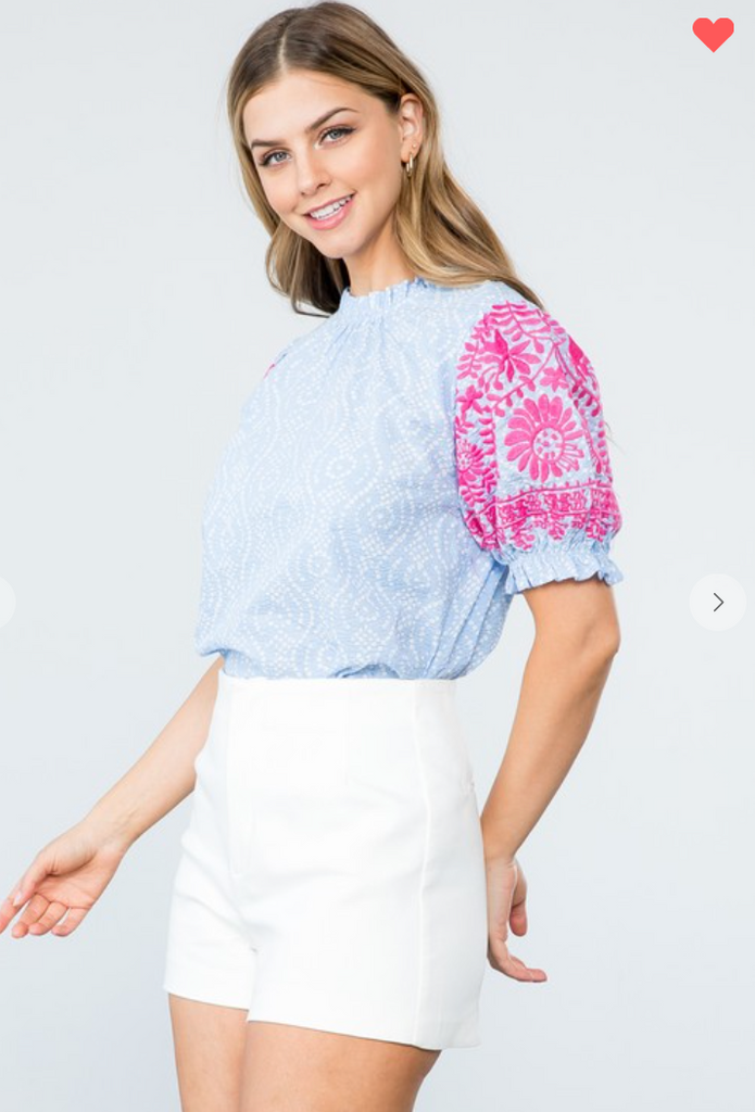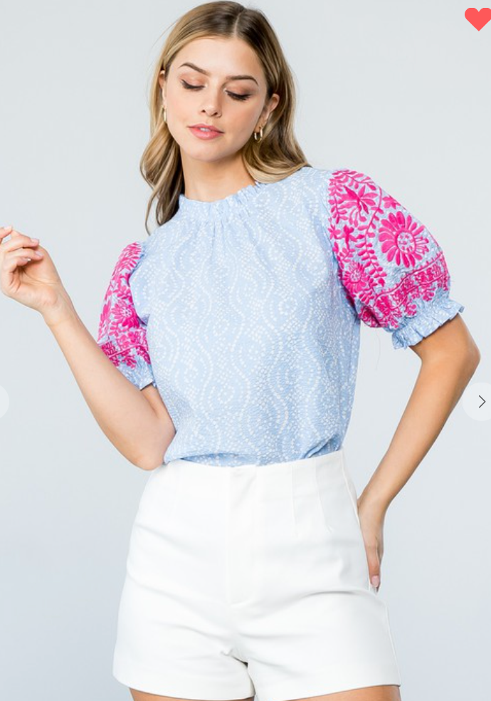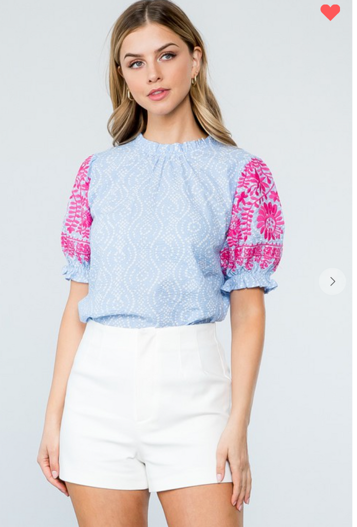 This darling top is so stylish and I love the white, blue and hot pink! The mix of embroidery and flutter sleeve and pop of color is soo cute!