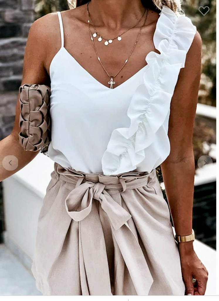 Ruffle goes all the way down, and elastic in the back! Fits great! Runs true to Size. Size down if in between! Wear with Winter White, Denim, or shorts! Can dress up or down!! It will be on Repeat!
