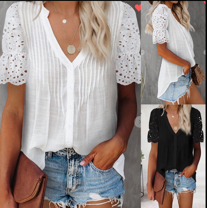 This adorable pink tucked, eyelet sleeve, button front top will be your go to! Made form a Cotton/Poly it is lightweight easy to wear look! Great fit and long enough in the back for all your front tucks! This will definitely be a staple for me this year