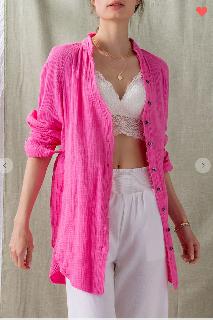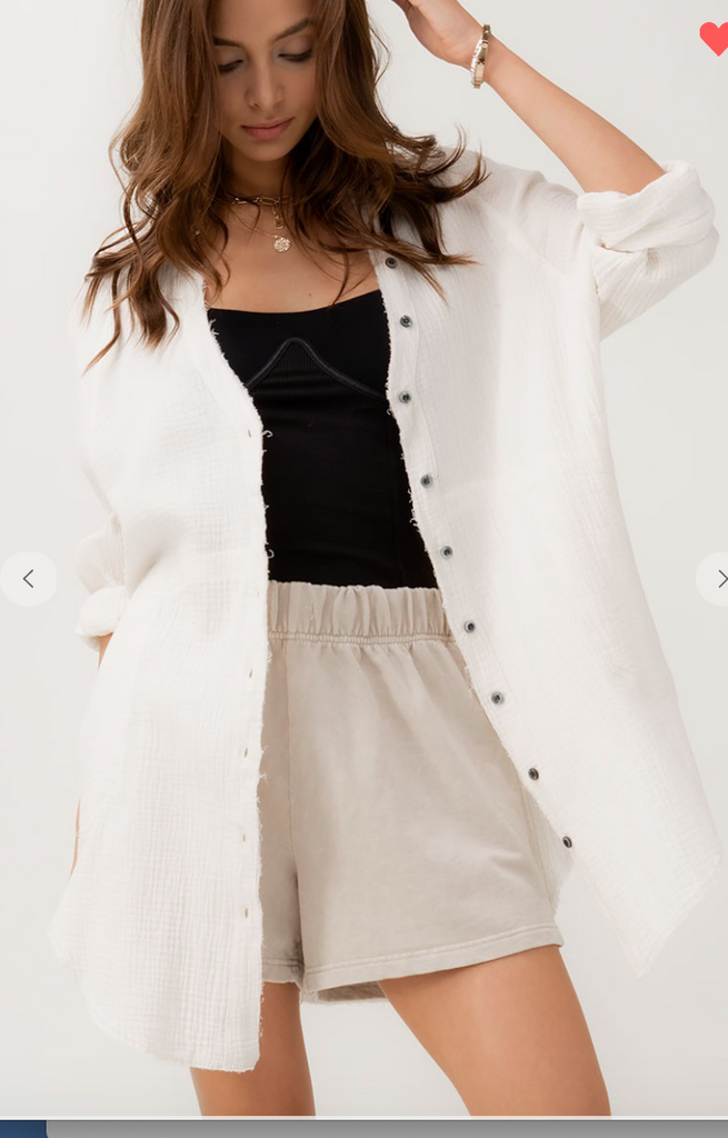 silhouette in a gorgeous crinkled gauze with dual front pockets. The raw hemline