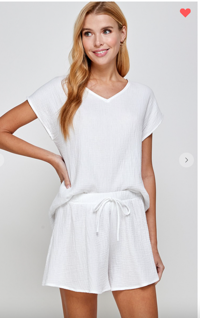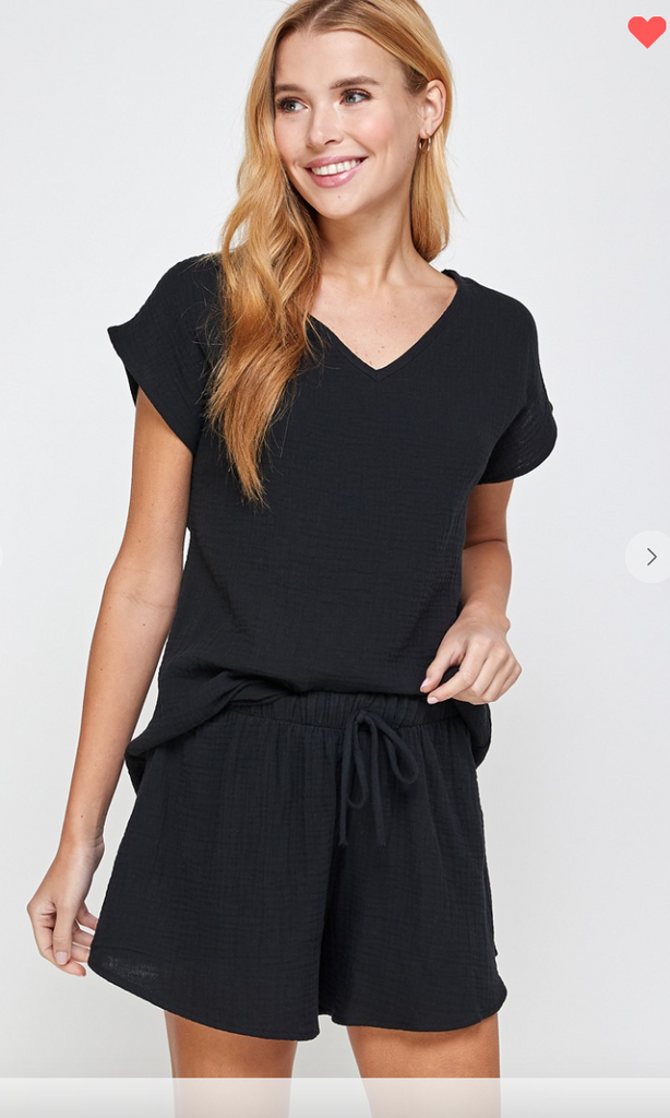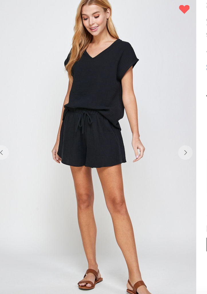 This one is perfection! A  V neck top with a cute cap sleeve paired with a high waist flowy drawstring pull on short! 2 for the price of 1