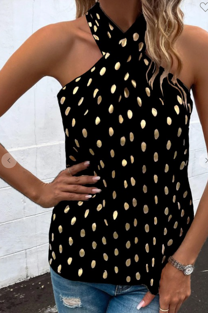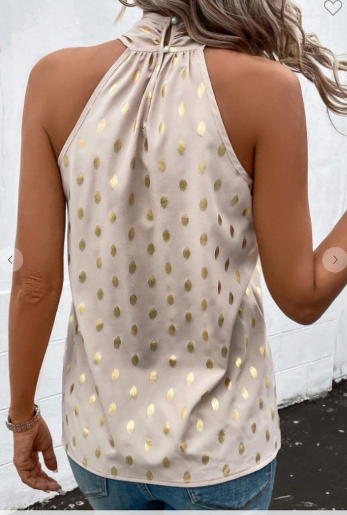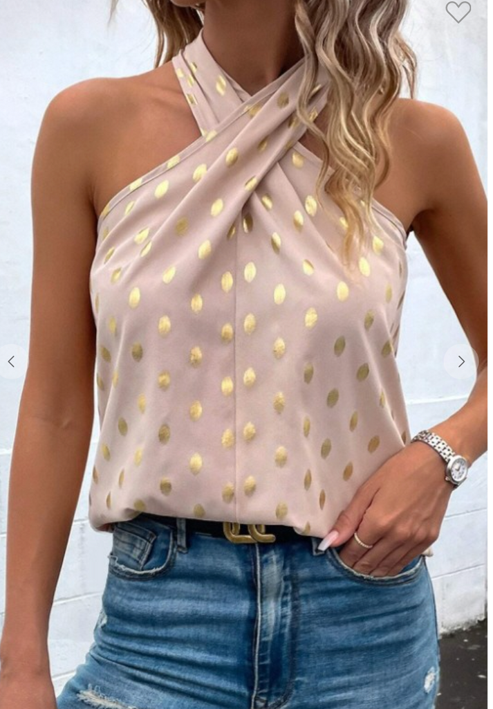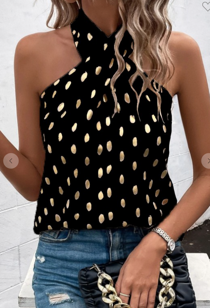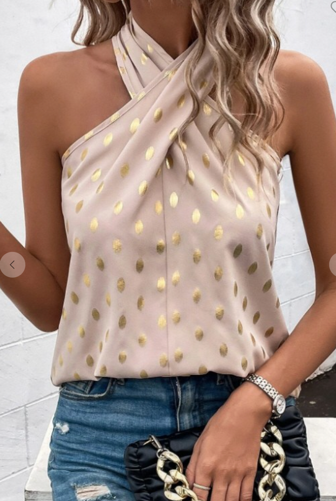 The great gold dotted fabric on either taupe or black is so stunning. And a halter is always a good idea as it is universally flattering!