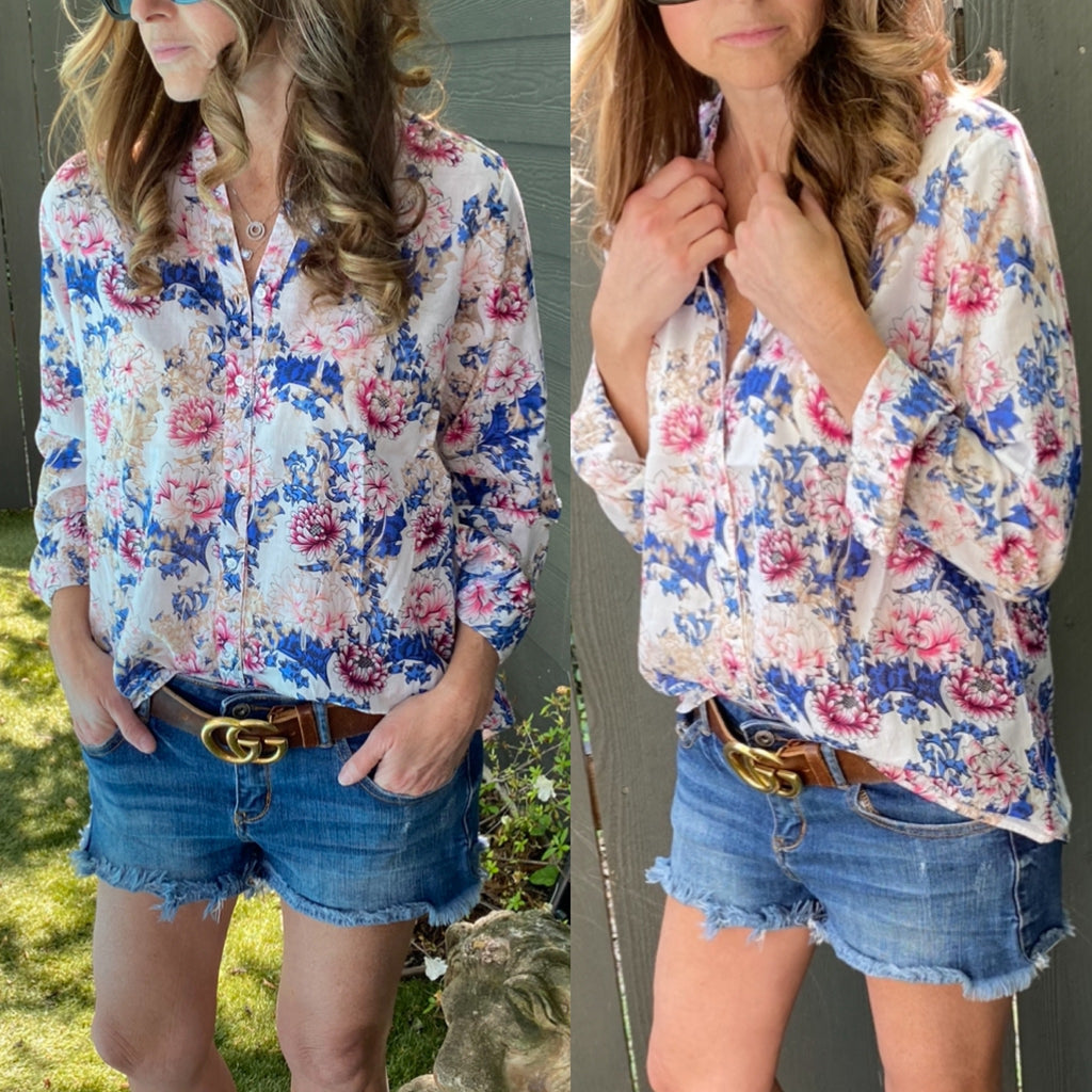 Gorgeous! This lightweight blouse has an amazing print and is the cutest for any occasion. Floral is so hot this year and this one looks great with all your denim and whites.
