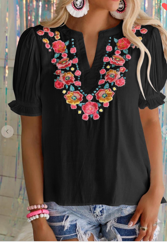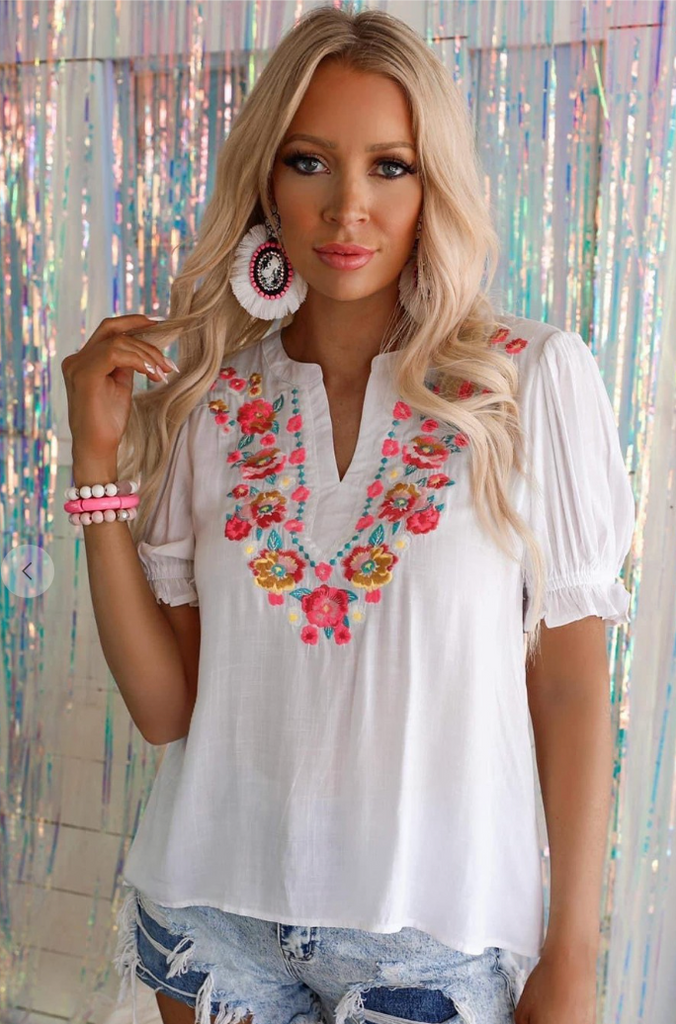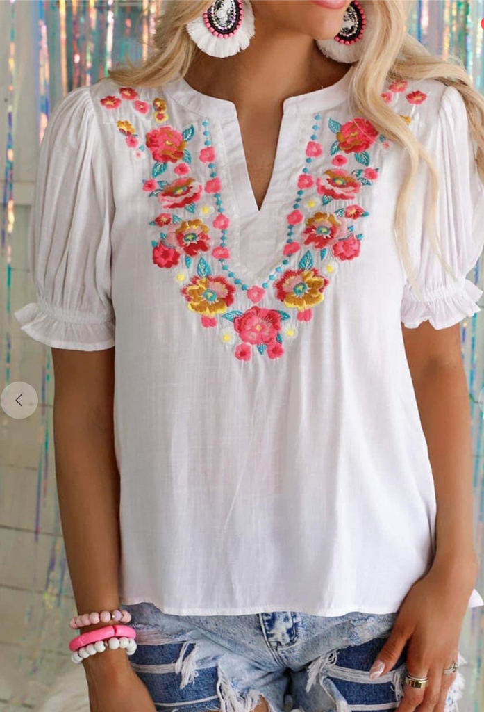 A floral embroidered top is always a great lookl! You can throw it on with denim, dress up your whites or dress down with shorts! LOVE the cute ruffle sleeves, V Neck beautiful standout embroidery and easy great fit!