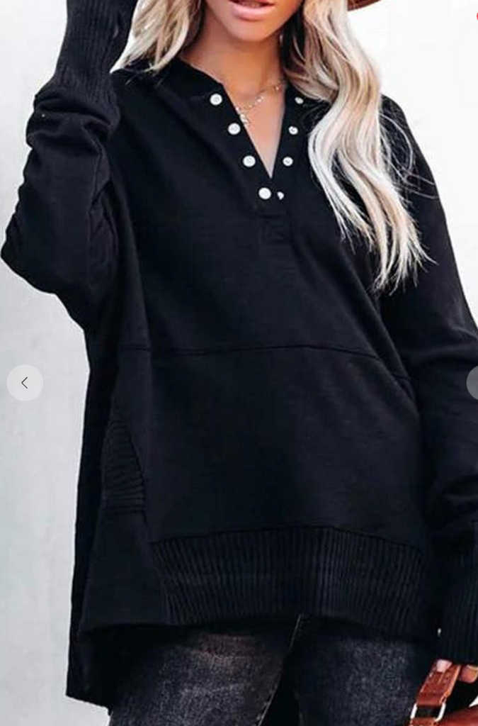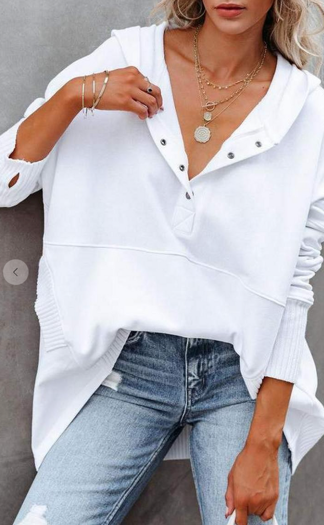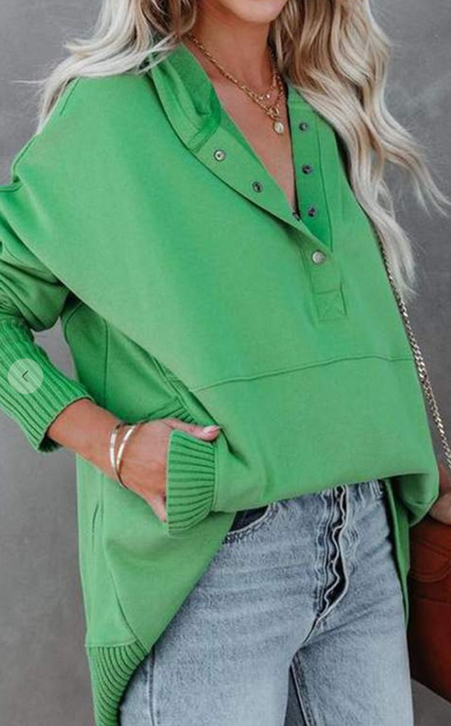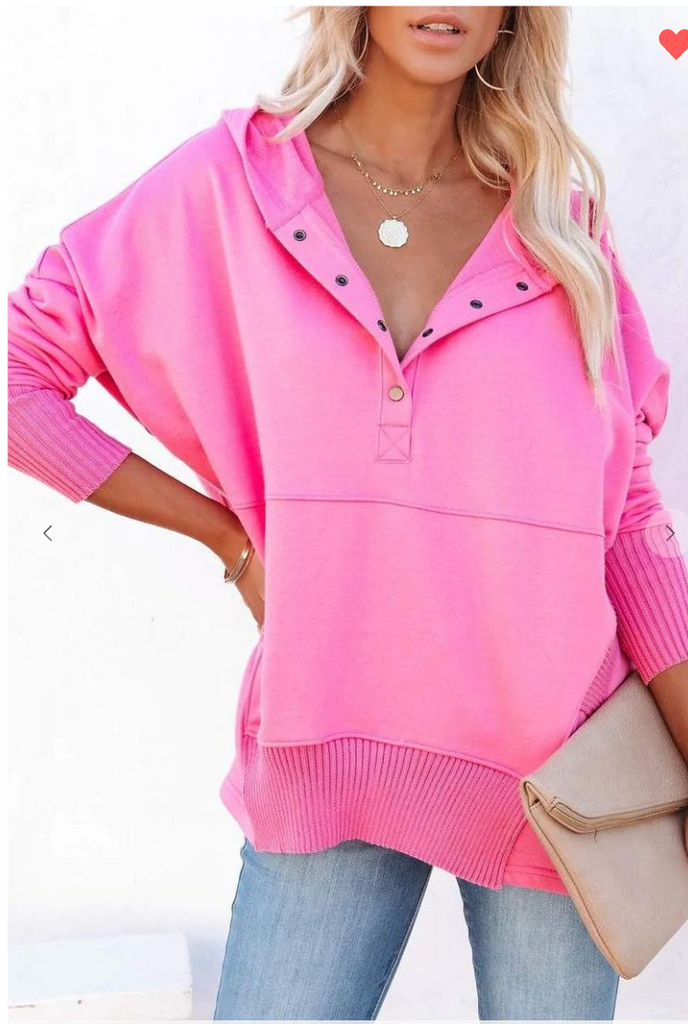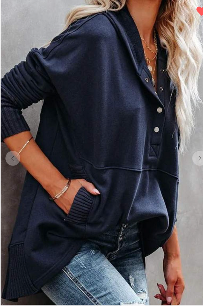 Oversized Solid Hoodie Top ,button up front, tunic length Ribbed cuffs, pockets and hemline and Side pockets