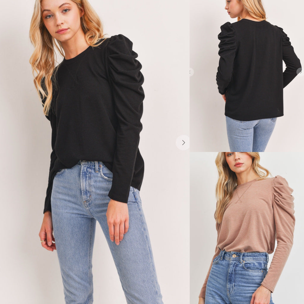 This DARLING puff long sleeve french terry knit has shirring at the sleeve, reverseve