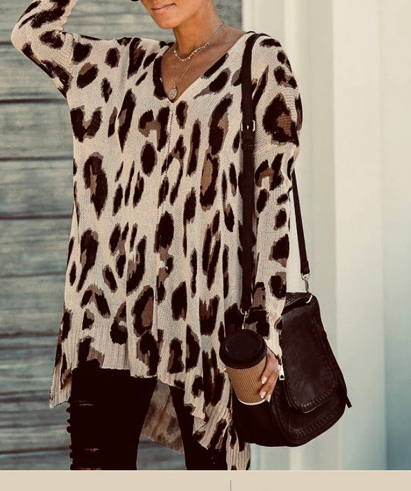 Our Lucy Leopard Knit Tunic features a black and mocha leopard print on a natural hued fine knit. This Beauty is designed to fit relaxed and effortless with a v-neckline and long sleeves.