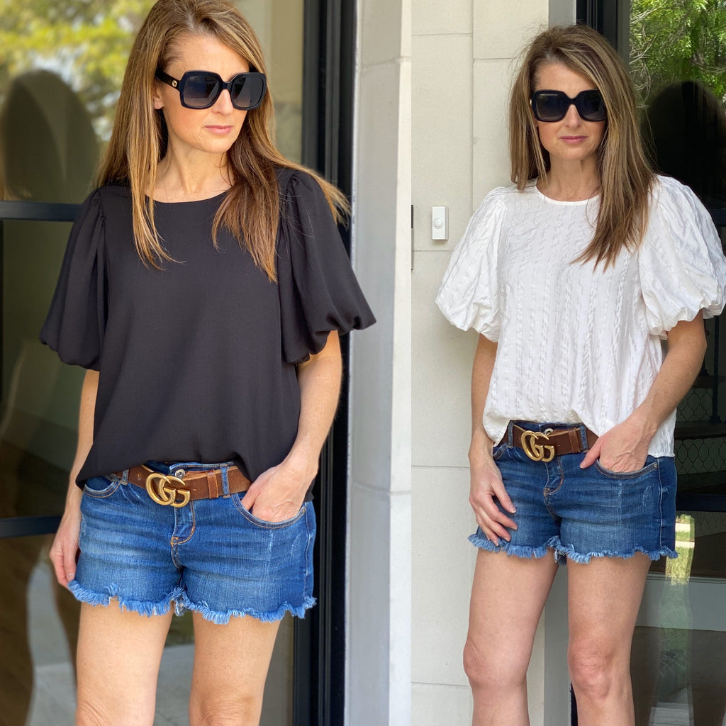 Grab this one for your Summer wardrobe. I PROMISE you will not be disappointed. It is the cutest black top you will wear. You can dress it down with shorts, or dress it up with white jeans or a skirt. It is so comfy and so easy to throw on.