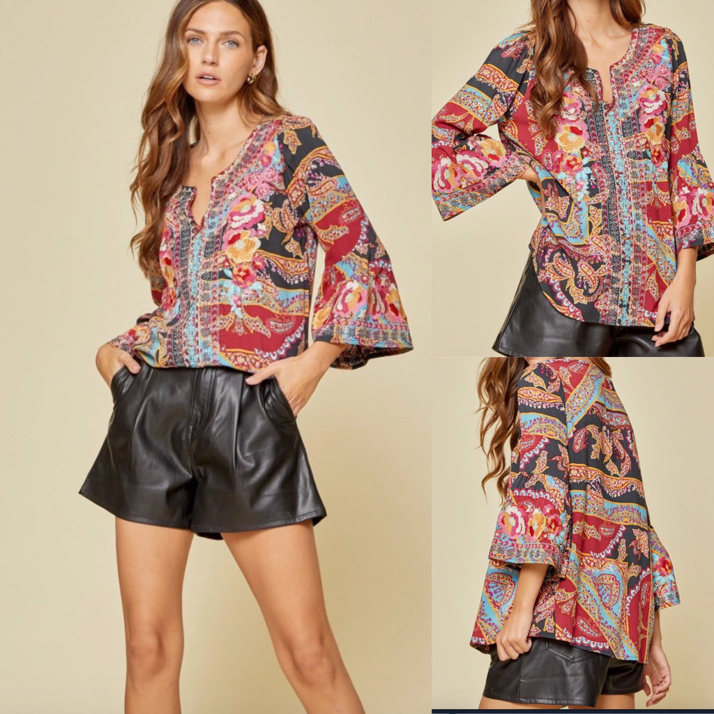 There is embroidery on the neckline and gorgeous print detail all over the blouse! Love the stunning neckline and cute 3/4 Bell Sleeve! Great Blouse!