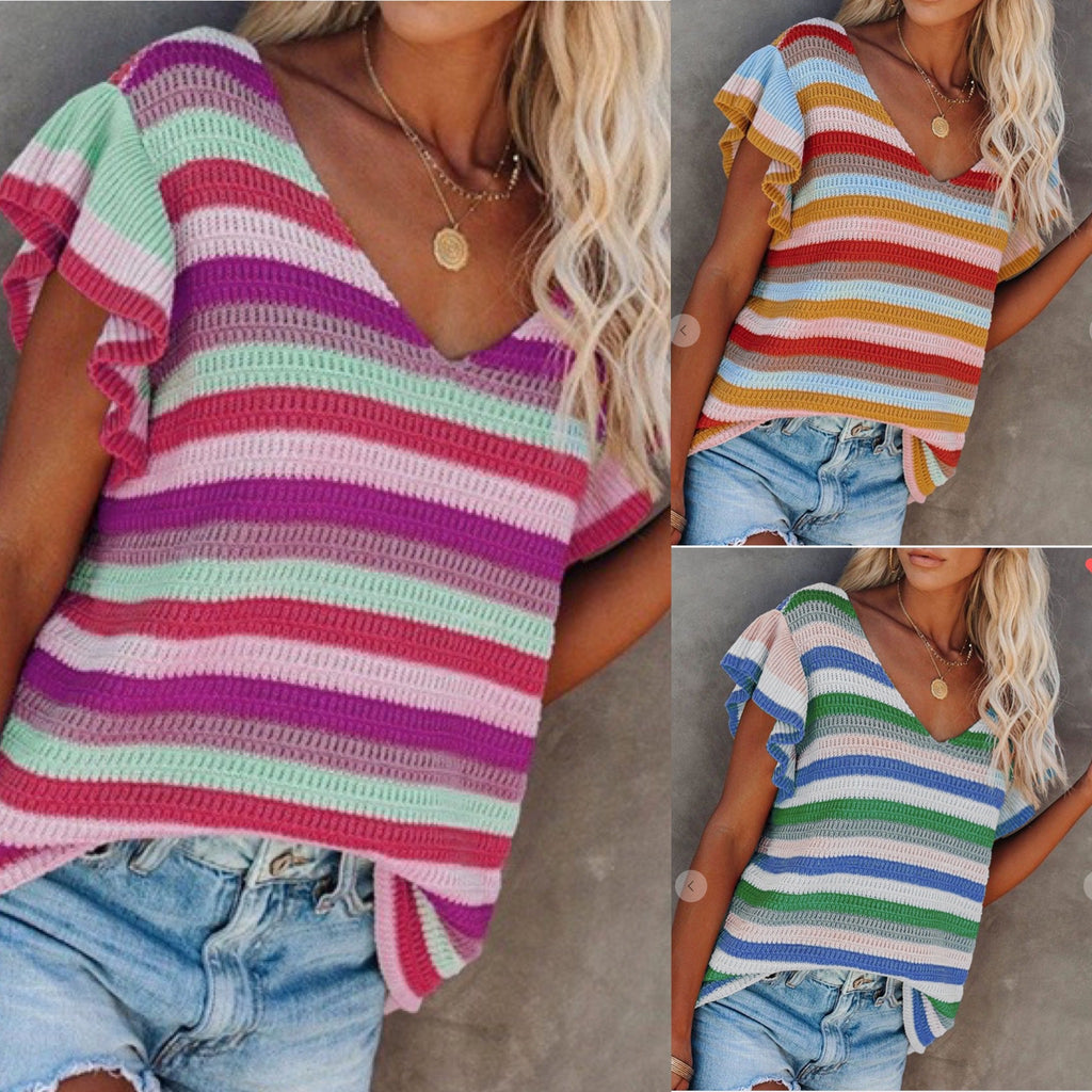 Our Striped Flutter Knit Top is perfectly femme regardless of the temp with retro themed stripes The casual tee with deep v neck, striped print, ruffled sleeve and loose hem design! The knitted top is made of high-quality material, making you enjoy a smooth soft touch and breathable against your skin How cute with all your bottoms- from white jeans and shirts to denim and skirts!