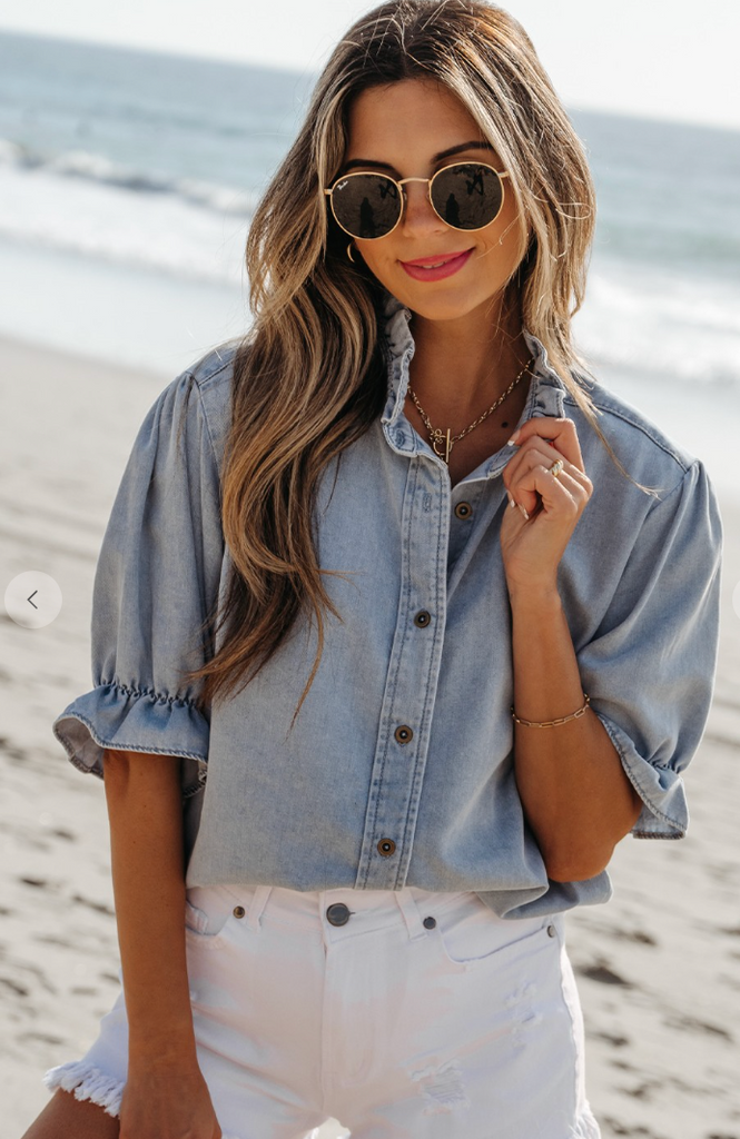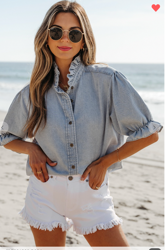 The ruffle sleeves , button front and cute style on this chambray top make it an elevated look! So classic look with white jeans or shorts!