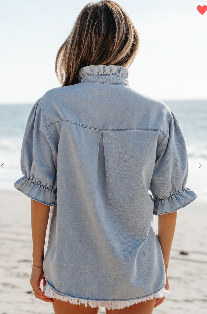 Ruffle Short Puff Sleeve Summer Chambray Shirt