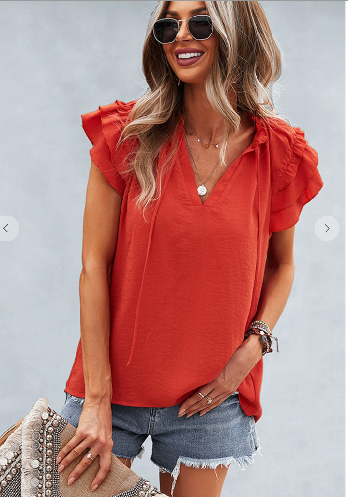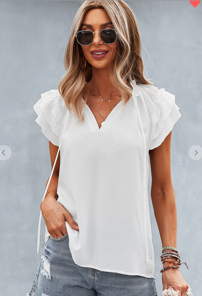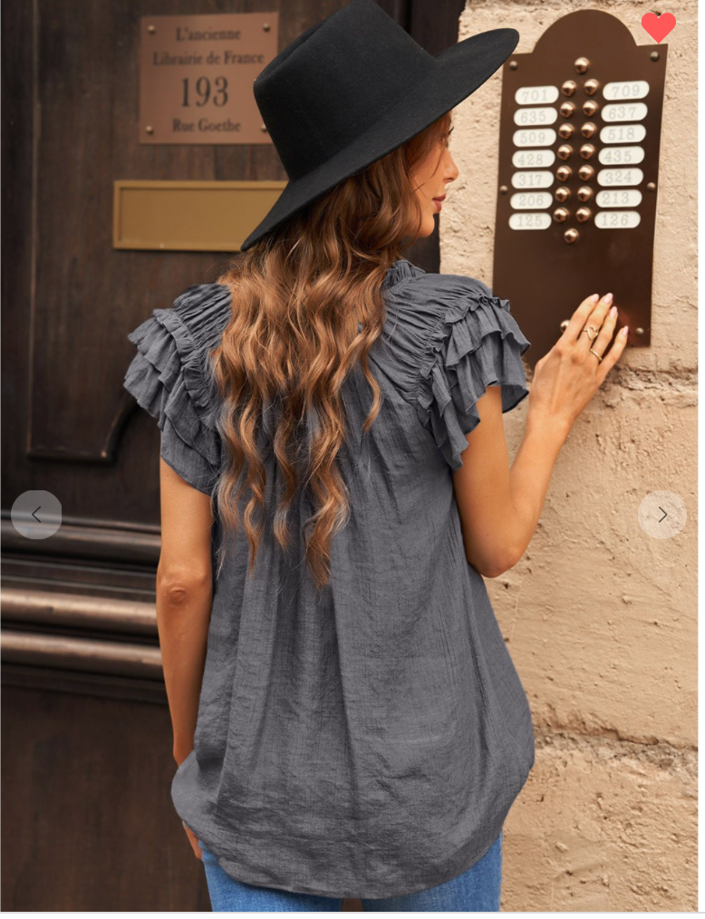 We love the V Neck, cute ruffle sleeve and shirring in the back!  Such a great blouse to keep you cool all Spring and Summer Long!