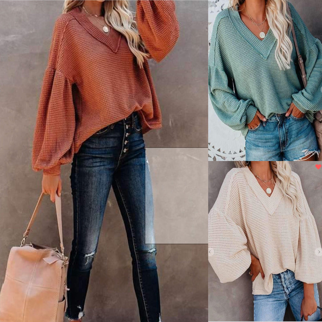 Waffle-knit tops have always been one of my favorite pieces to wear! They are so comfy and add texture to a great piece. I love the Balloon Sleeve on this one, and great V Neck. Loose fit which works great for a front tuck!