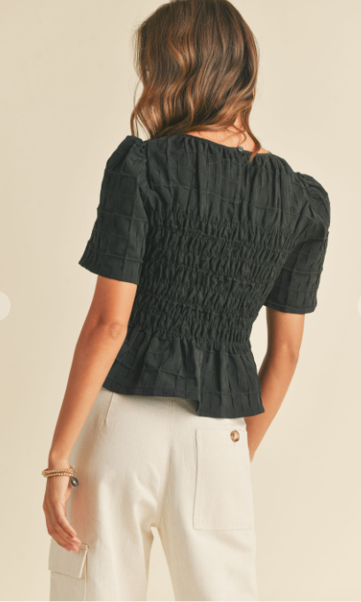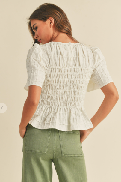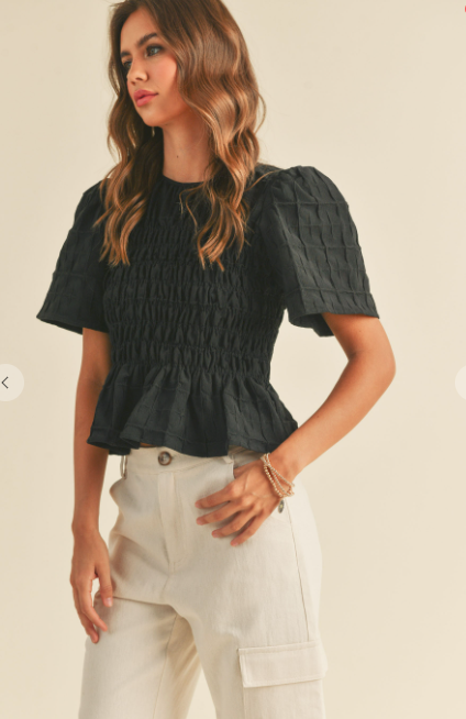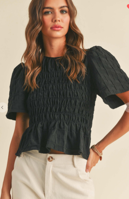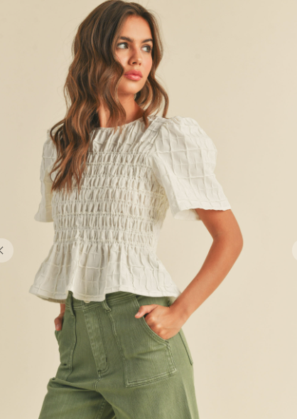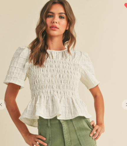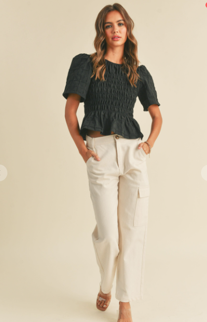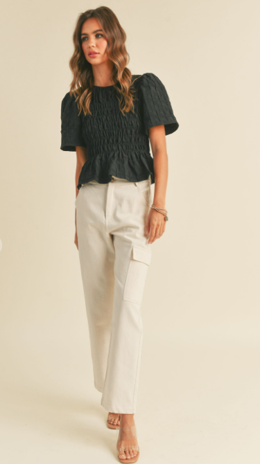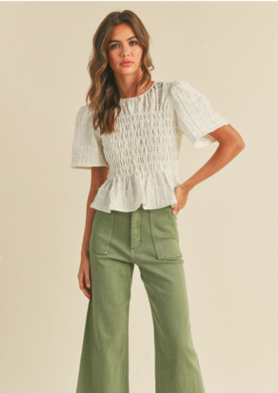 SMOCKED TOP: is ADORABLE! YES PLEASE! It has a great textured fabric with darling sleeve, and a smocked body. Hits below the waist and is perfect for high waisted pants.