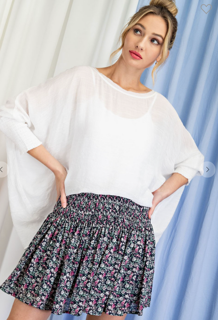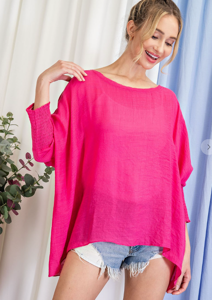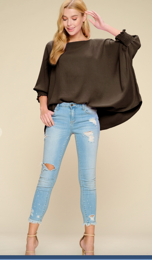 The fit, the colors, the lightweight fabric make it the most amazing piece in your closet.Love the Dolman sleeves, smocked cuffs and easy to wear. It has great coverage and you can do a front tuck and pair with leggings, skirts, shorts or jeans!