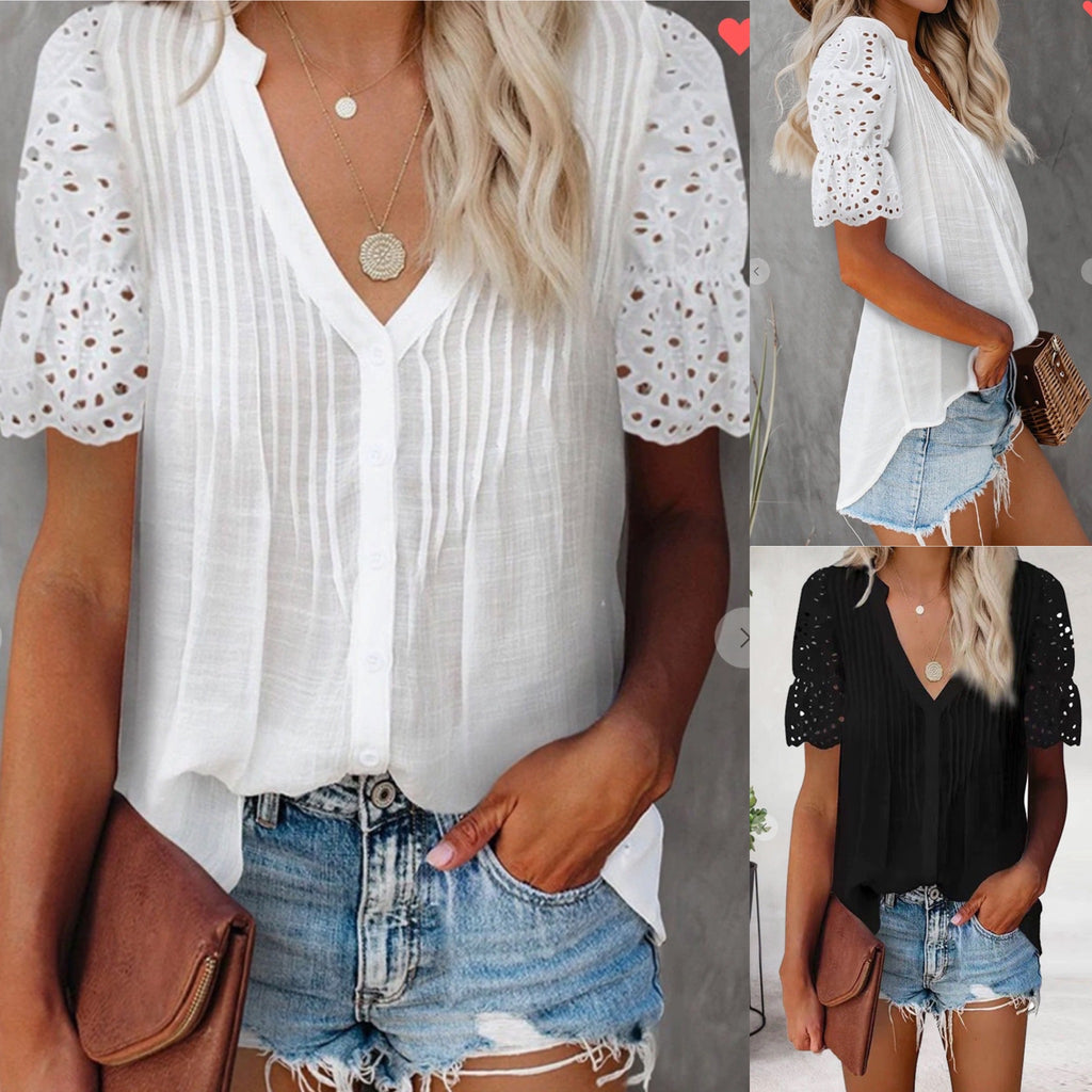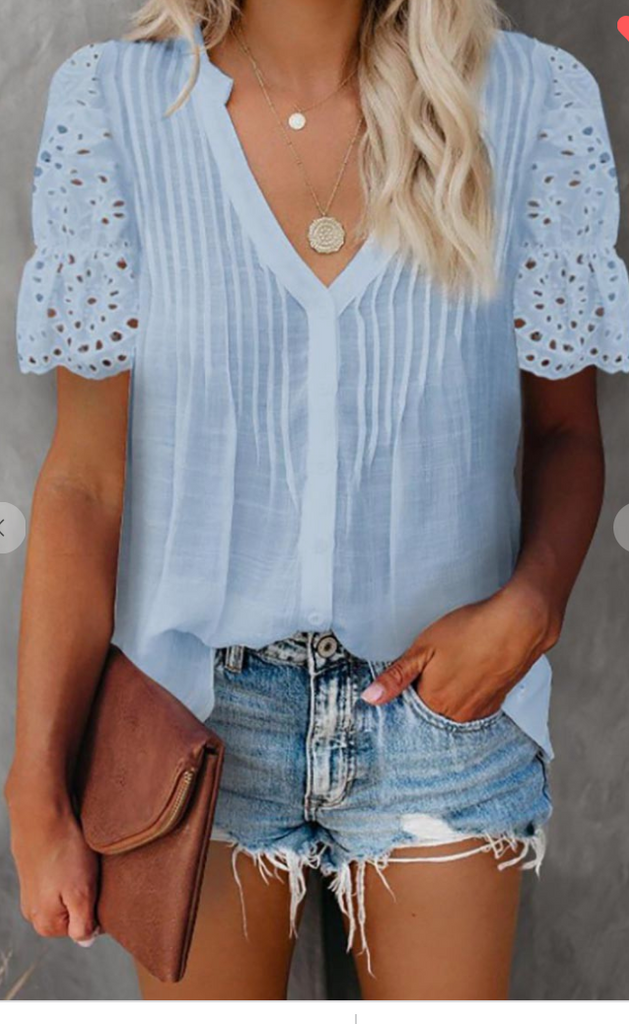 This adorable pink tucked, eyelet sleeve, button front top will be your go to! Made form a Cotton/Poly it is lightweight easy to wear look! Great fit and long enough in the back for all your front tucks! This will definitely be a staple for me this year