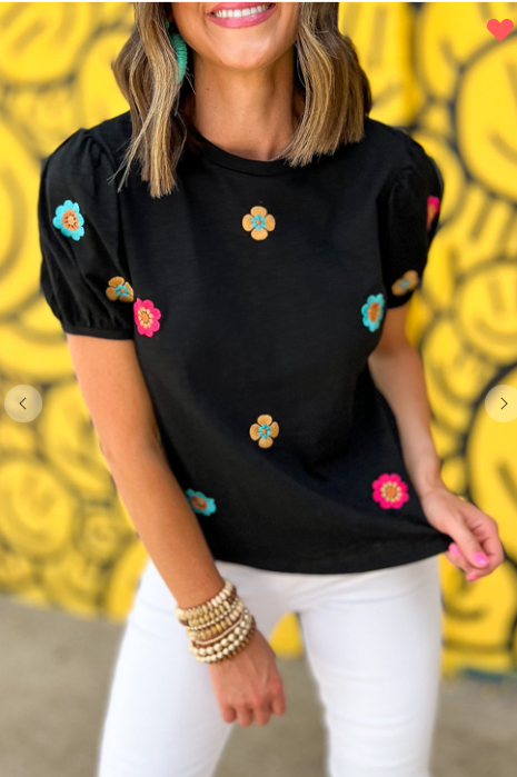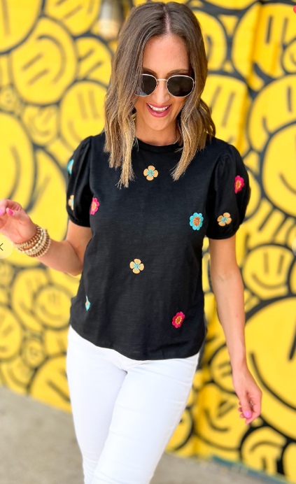 Dress up your Tee with this Pop of Color! These colorful embroidered flowers set against the black tee with go with all your bottoms this season! Love the cute sleeves, and fun color!