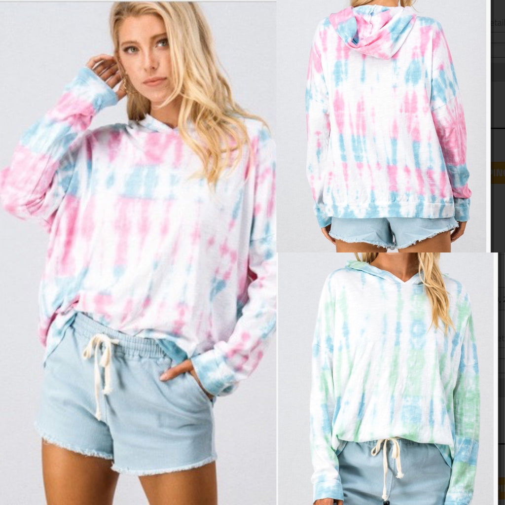 We love our Tie Dye Cotton Slub Lightweight Hooded Shirt! Wear with all your cute shorts and jeans! Look fab and on Trend! And still feel comfy and cute and in Style!
