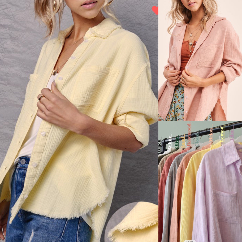 silhouette in a gorgeous crinkled gauze with dual front pockets. The raw hemline