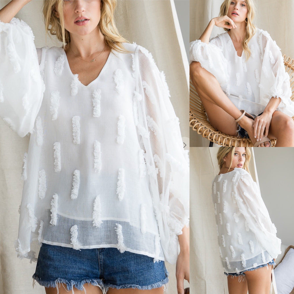A Great V-Neck which we all LOVE, a sheer sleeve gorgeous textured fabric, fully lined and elastic at the sleeves. I mean to die for!
