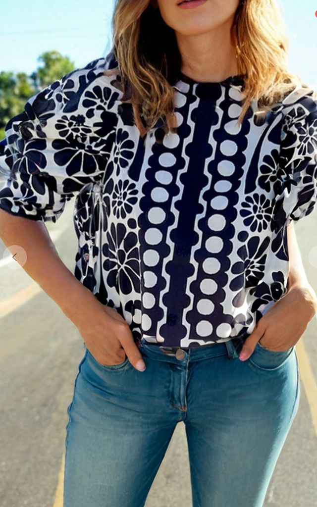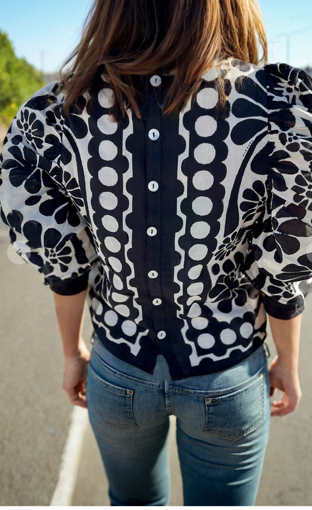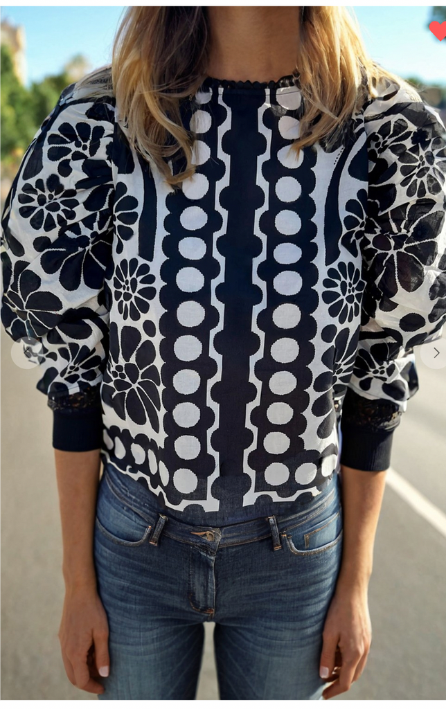 This blouse features a charming black and white floral print mix