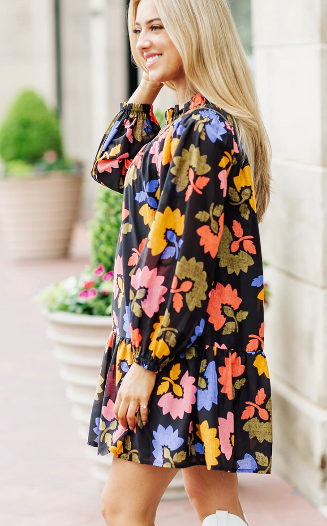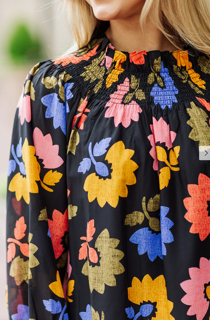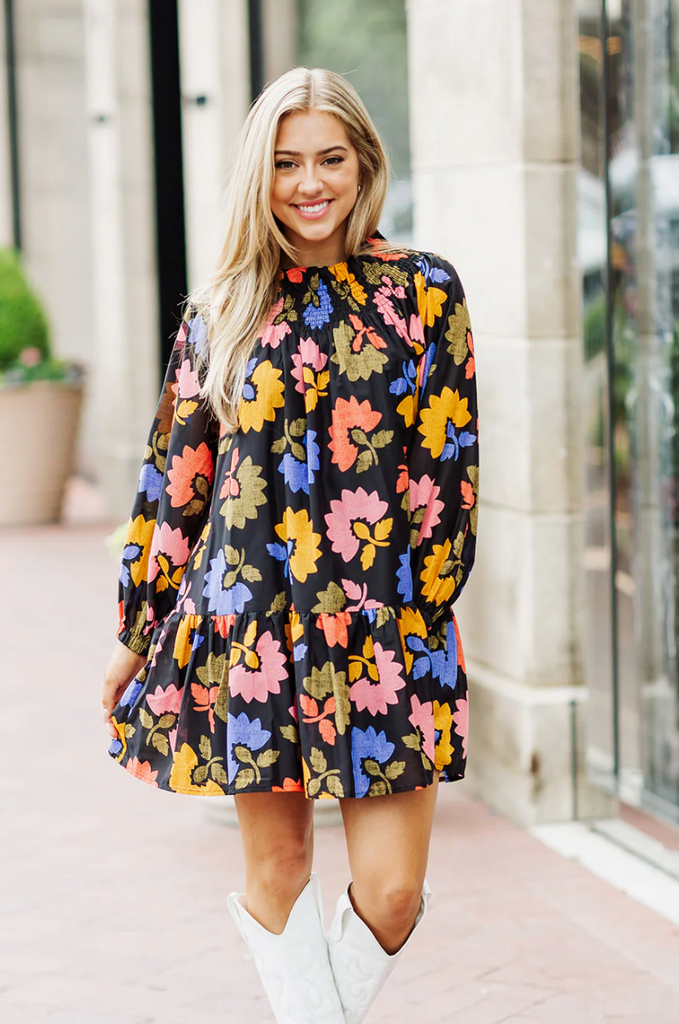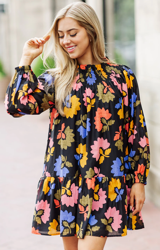 This is from one of our Higher End lines that we love. They brought us the lace kaftan dress (which is one of my FAVORITES) and this one we hand picked at Market. It just arrived and is the perfect transitonal dress. Can be worn on or off the shoulders due to the great smocking!