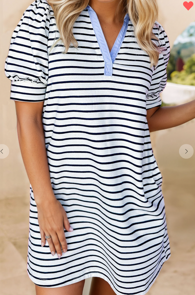 This dress is so cute but yet so comfy and chi with t shirt style. It features classic striped pattern with contrast v neck and collar. -The puff short sleeves make this tee dress graceful.