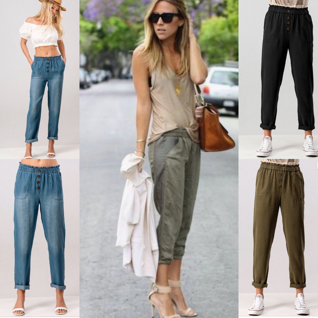 Full elastic waistband, side pockets and faux front buttons. Roll up or leave down. Darling with tennis shoes, flats, wedges, sandals! 100% TENCEL