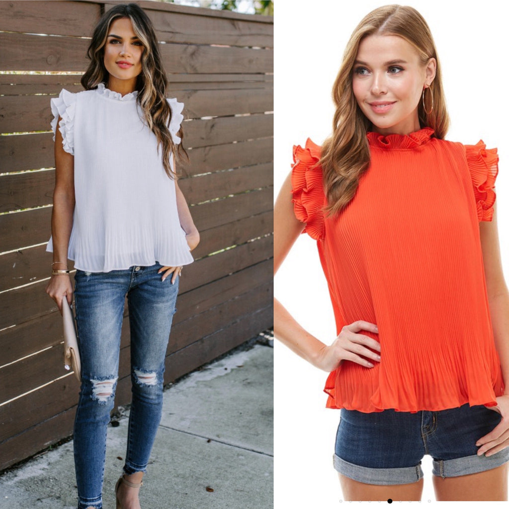 This Plisse Pleat Blouse is so adorably femme! We love the crisp white base that comes tightly pleated throughout. Ruffles trim the mock neckline and create the cap sleeve trim. The relaxed fit is perfectly effortless for work or play! Pair yours with your favorite pair of distressed denim and heels. Finished with a full lining and a back keyhole button closure.
