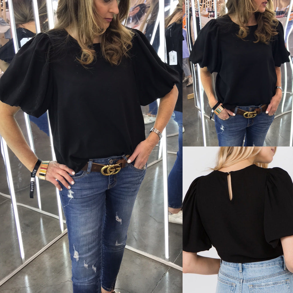 The Black is a solid with sleeves that have a very comfortable elastic that makes it an elevated T Shirt with style. A great billowy look that creates interest and the length is great. I have it tucked in but you could also wear it out with a cute skirt! It is comfortable and the fit is great! SOO cute!\